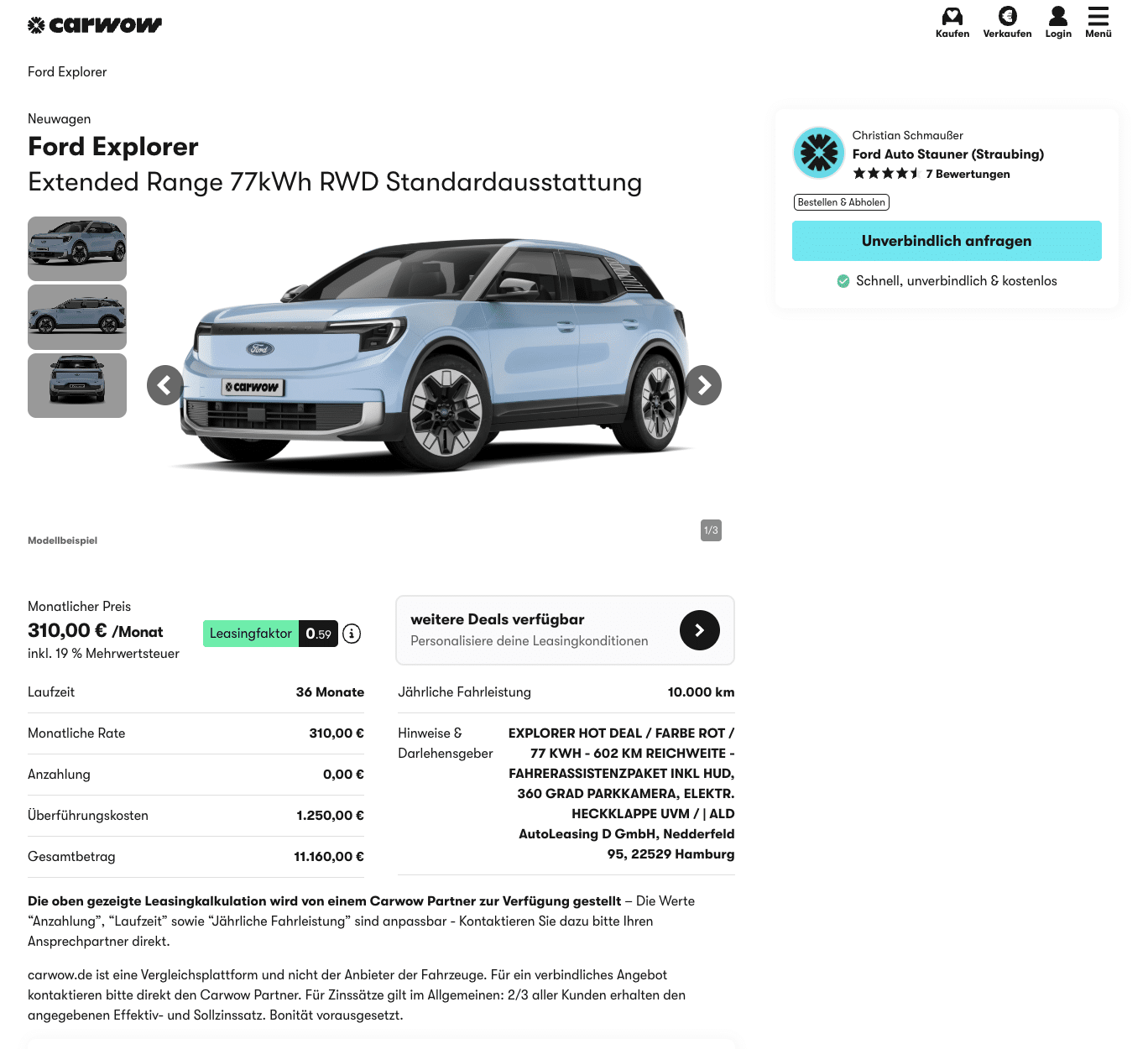 Bei carwow gibt es jetzt ein E-SUV, das Lifestyle, Raum und Technik in einer neuen Dimension kombiniert, den Ford Explorer Extended Range RWD 77 kWh. Für nur 310 Euro brutto im Monat könnt ihr das Modell im Privat– wie im Geschäftsleasing fahren. Es handelt sich um einen sofort verfügbaren Neuwagen in kräftigem Rot, ein Auto, das auffällt, sobald es auf den Asphalt rollt. Während beim Marktführer fast 600 Euro brutto fällig werden, spart ihr hier Monat für Monat deutlich.