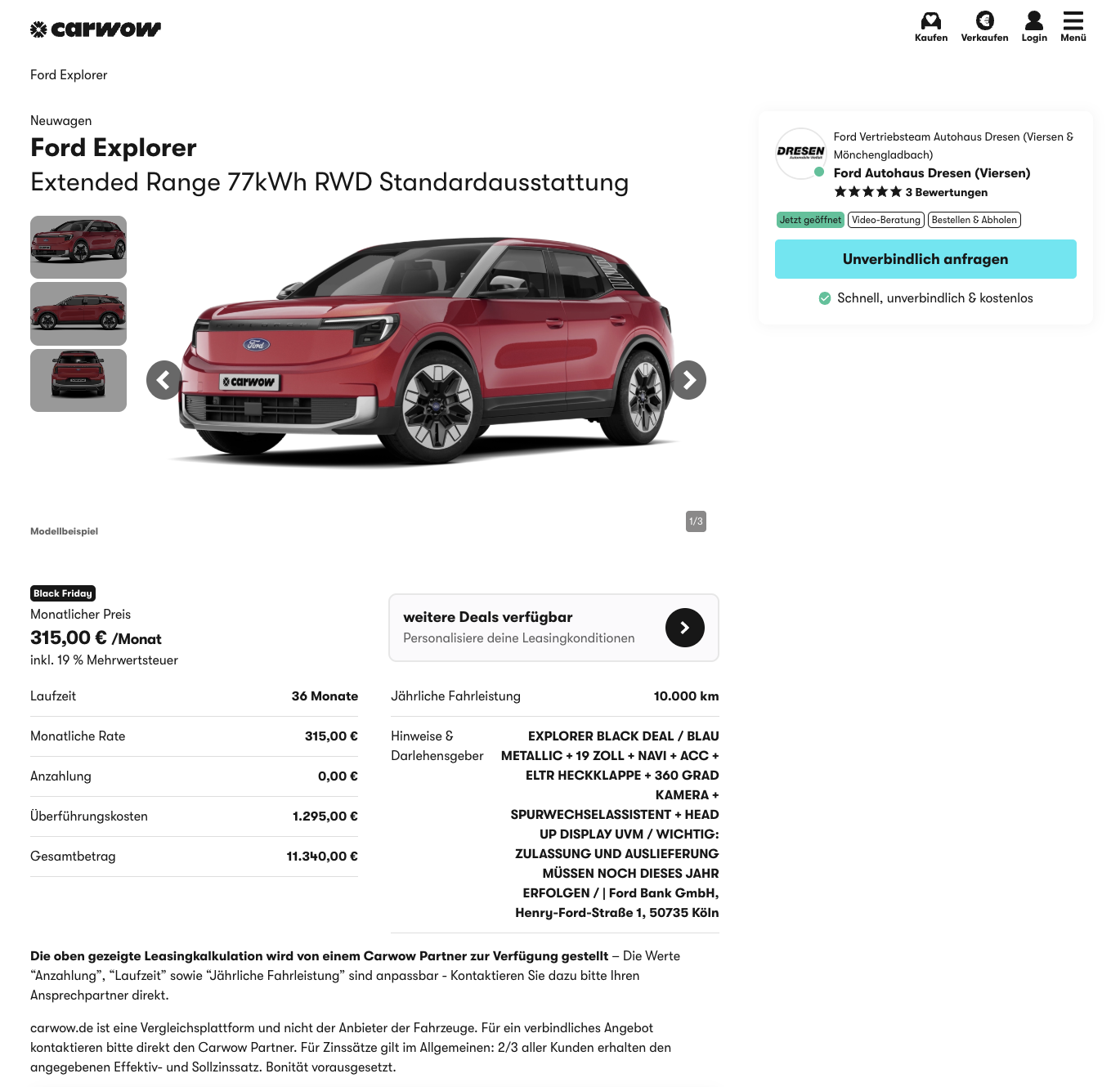 Mit 315 Euro brutto im Monat platziert sich der Ford Explorer Extended Range deutlich unter dem, was der bekannte Platzhirsch für ein vergleichbares Paket aufruft, dort stehen 560 Euro brutto monatlich auf der Uhr. Das sind 245 Euro Unterschied pro Monat.