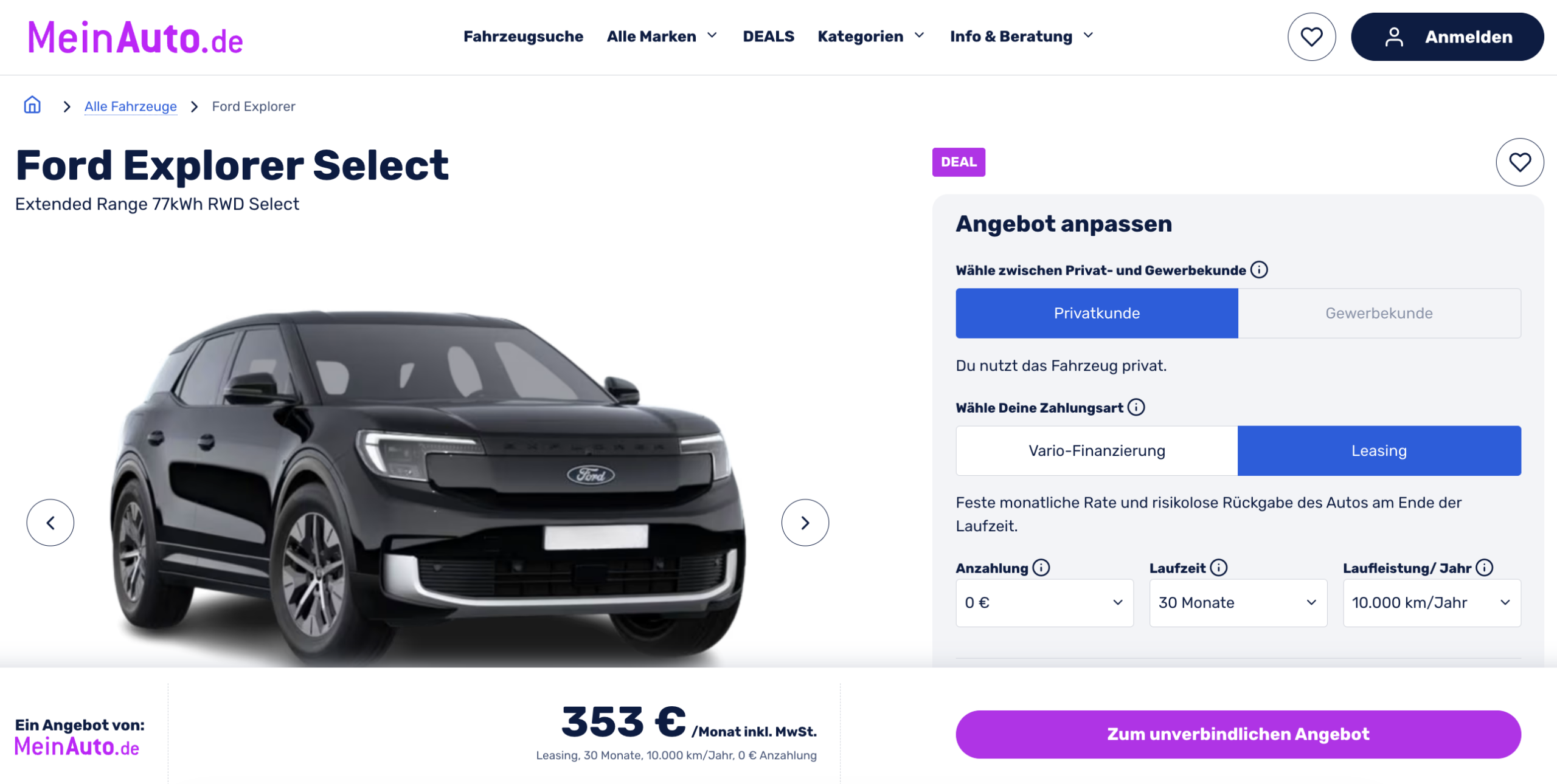 Lust auf ein neues Elektro-SUV von Ford? Bei MeinAuto.de könnt ihr den Ford Explorer Elektro Extended Range 77 kWh RWD für 353 Euro brutto im Monat leasen.