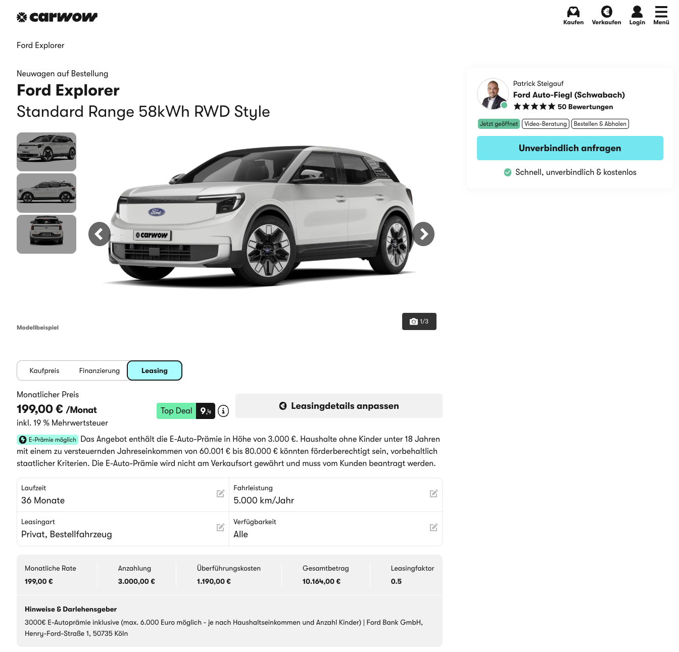 Viel Platz, leiser Antrieb, moderne Technik, genau so sieht ein alltagstauglicher Elektro-SUV heute aus. Den Ford Explorer Standard Range 58 kWh RWD Style können Privatkunden bei carwow für 199 Euro brutto pro Monat leasen, möglich gemacht durch die neue Umweltprämie mit 3.000 Euro als Sonderzahlung. Weil es sich um ein frei konfigurierbares Bestellfahrzeug handelt, bleibt der Explorer kein Auto von der Stange, Lack, Felgen und Ausstattung lassen sich so zusammenstellen, wie es zum eigenen Alltag passt.