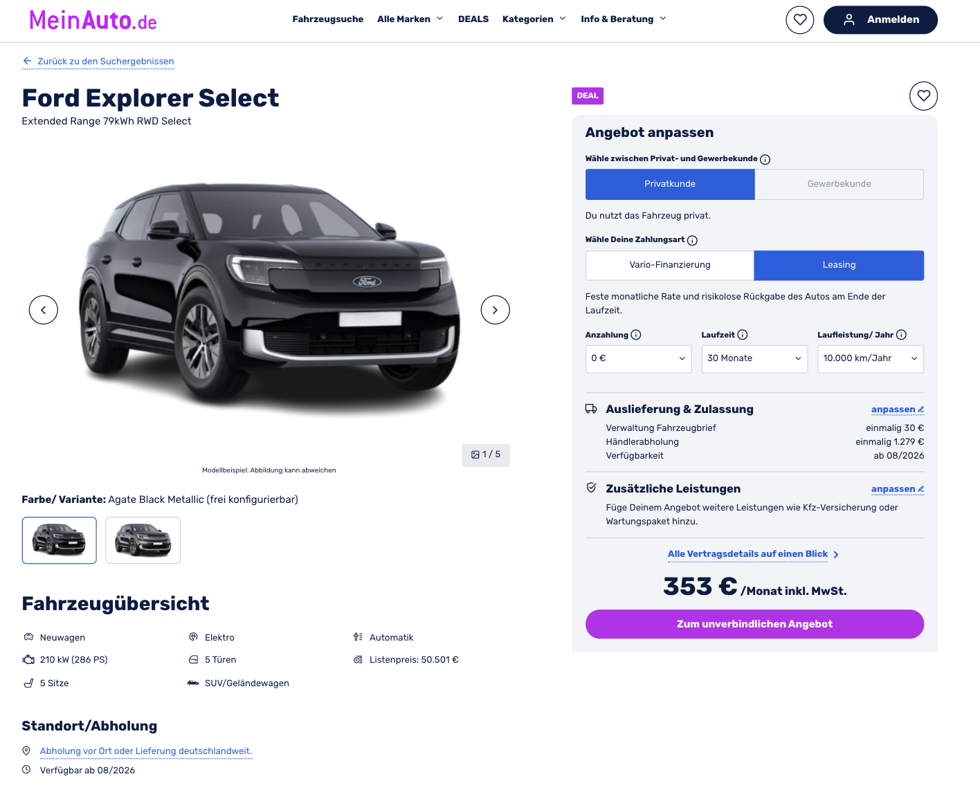 Der Ford Explorer Elektro bringt genau die Mischung mit, die im aktuellen Markt besonders gefragt ist, modernes SUV-Format, viel Platz, starke Reichweite und ein Leasingpreis, der nicht sofort in unvernünftige Regionen abdriftet. Ford Explorer Elektro Extended Range 77 kWh RWD Select bei MeinAuto.de für 353 Euro brutto im Monat ist deshalb ein Angebot, das man sich genauer ansehen sollte. Es handelt sich um ein frei konfigurierbares Bestellfahrzeug, das sich nach den eigenen Wünschen zusammenstellen lässt. Die Auslieferung ist für August vorgesehen, was dem Deal zusätzlich Relevanz verleiht. Besonders stark ist dabei, dass keine Anzahlung und keine Sonderzahlung einkalkuliert wurden. Genau das macht die Monatsrate transparent und leicht vergleichbar.