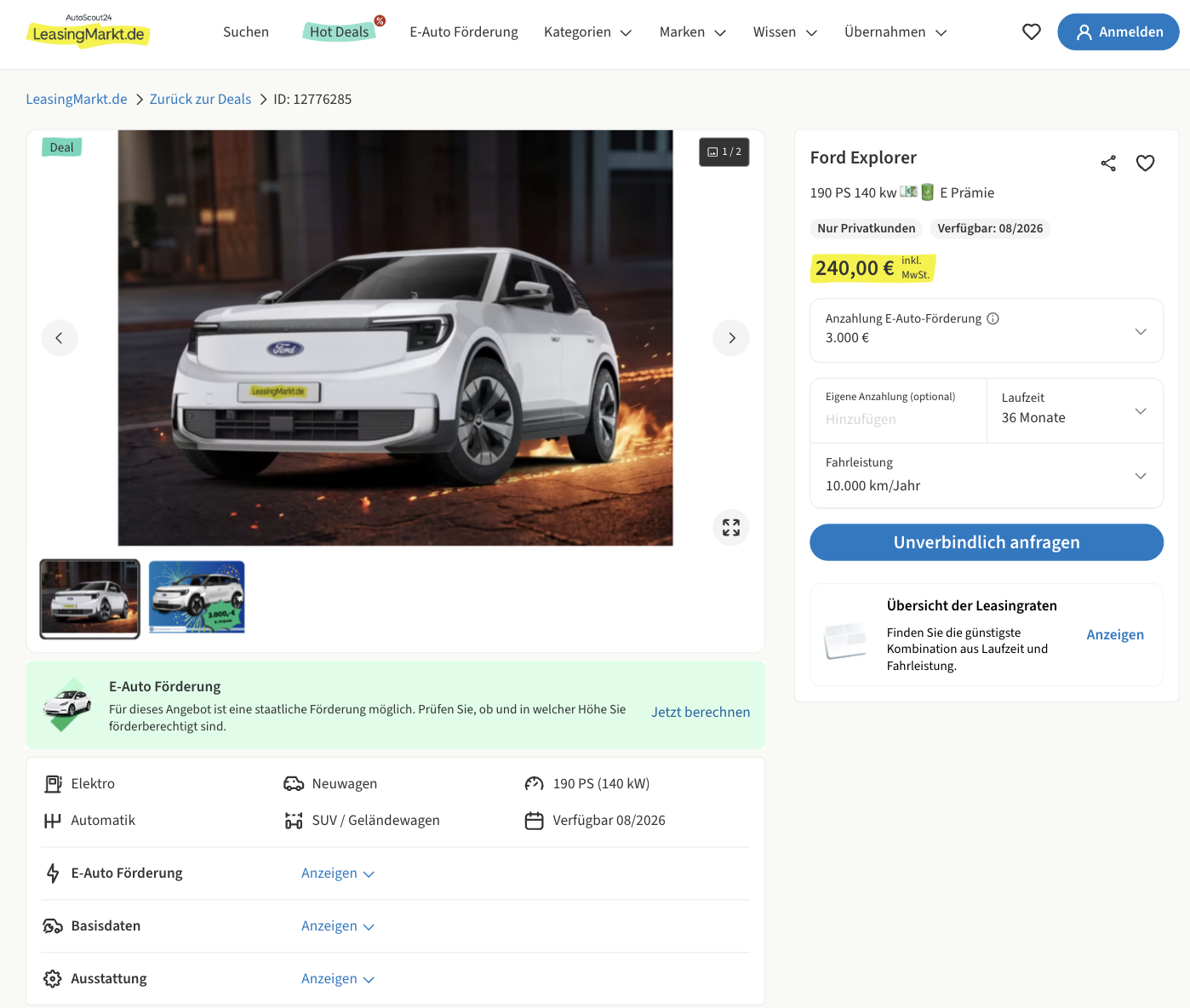 Ein vollelektrisches SUV mit großzügigem Raumangebot und moderner Plattform muss nicht automatisch teuer sein. Ford Explorer Standard Range 58 kWh RWD bei LeasingMarkt für 240 Euro brutto im Monat zeigt, wie sich ein aktuelles E-SUV zu attraktiven Konditionen fahren lässt. Das Angebot wurde mit einer Umweltprämie von 3.000 Euro kalkuliert und ist ab August 2026 verfügbar. Rechnet man die Prämie realistisch auf die Laufzeit um, ergibt sich eine normalisierte Rate von 323,33 Euro brutto monatlich, wodurch das Angebot sauber vergleichbar bleibt.