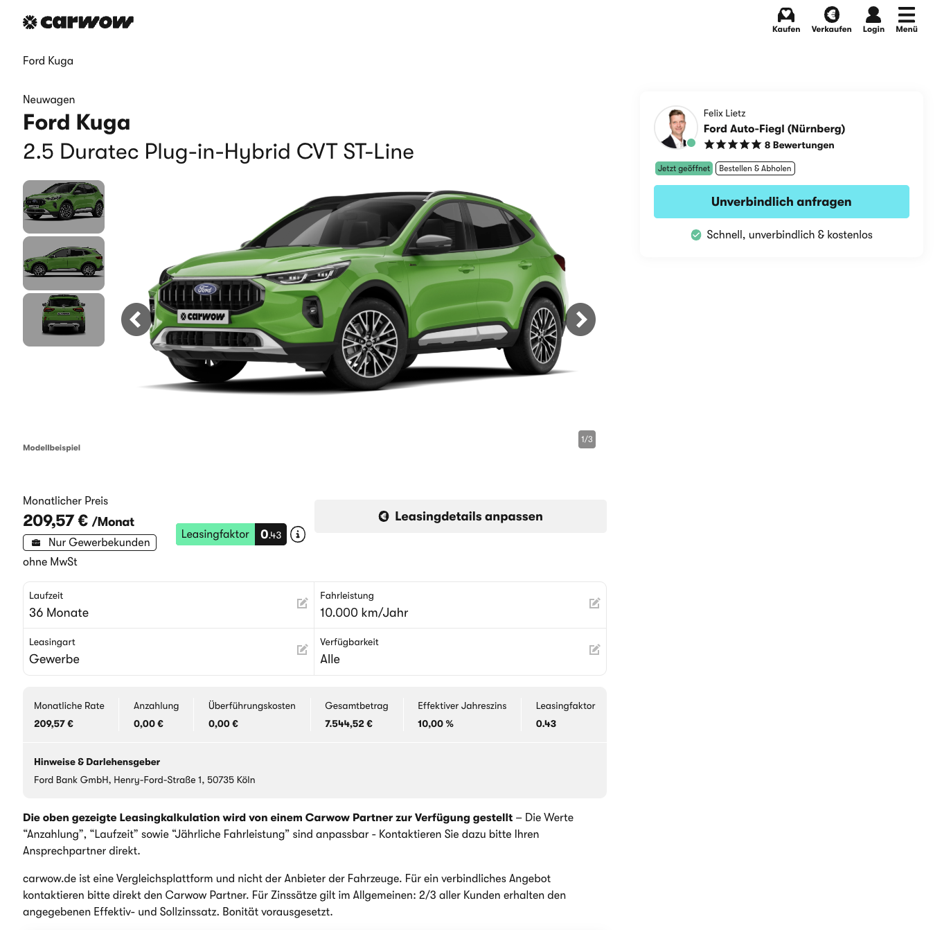Kalkuliert ist das Angebot mit 36 Monaten Laufzeit und 10.000 Kilometern pro Jahr. Beim Platzhirsch werden für den Kuga 412 Euro netto pro Monat genannt, hier startet ihr bei 210 Euro netto, und damit wird der PHEV plötzlich nicht nur technisch interessant, sondern auch rechnerisch.