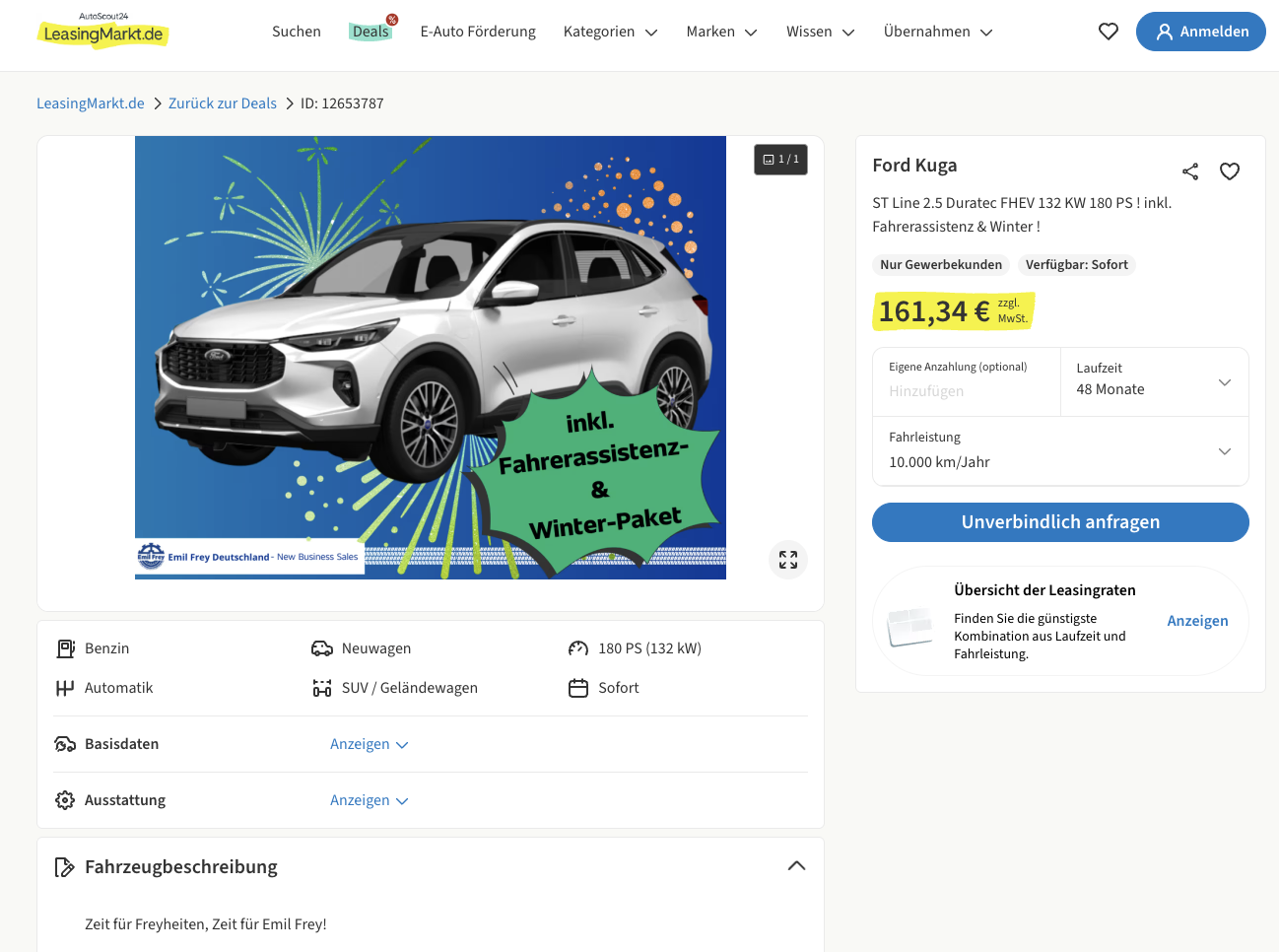 Die Kalkulation basiert auf 48 Monaten Laufzeit und 10.000 Kilometern pro Jahr. Im direkten Vergleich zeigt sich, wie stark dieses Angebot positioniert ist. Während vergleichbare Modelle beim Marktführer bei rund 337 Euro netto monatlich liegen, bleibt dieser Kuga mit 161,34 Euro netto klar darunter.