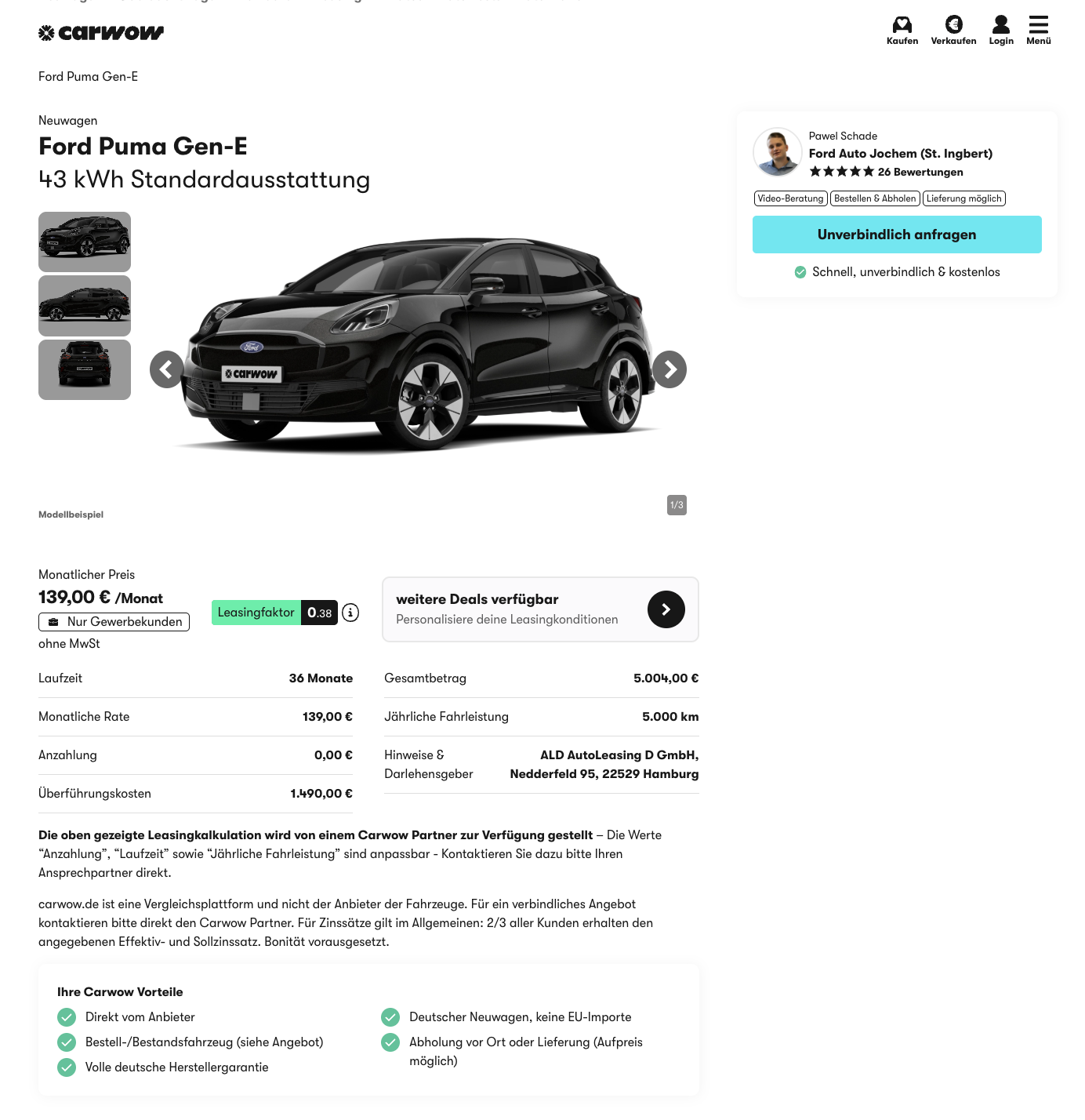 Die Konditionen bei carwow sind klar gesteckt, 24 Monate Laufzeit mit 5.000 Freikilometern pro Jahr. Damit eignet sich der Ford Puma Gen-E 43 kWh besonders für Gewerbekunden mit überschaubarer Jahresfahrleistung.