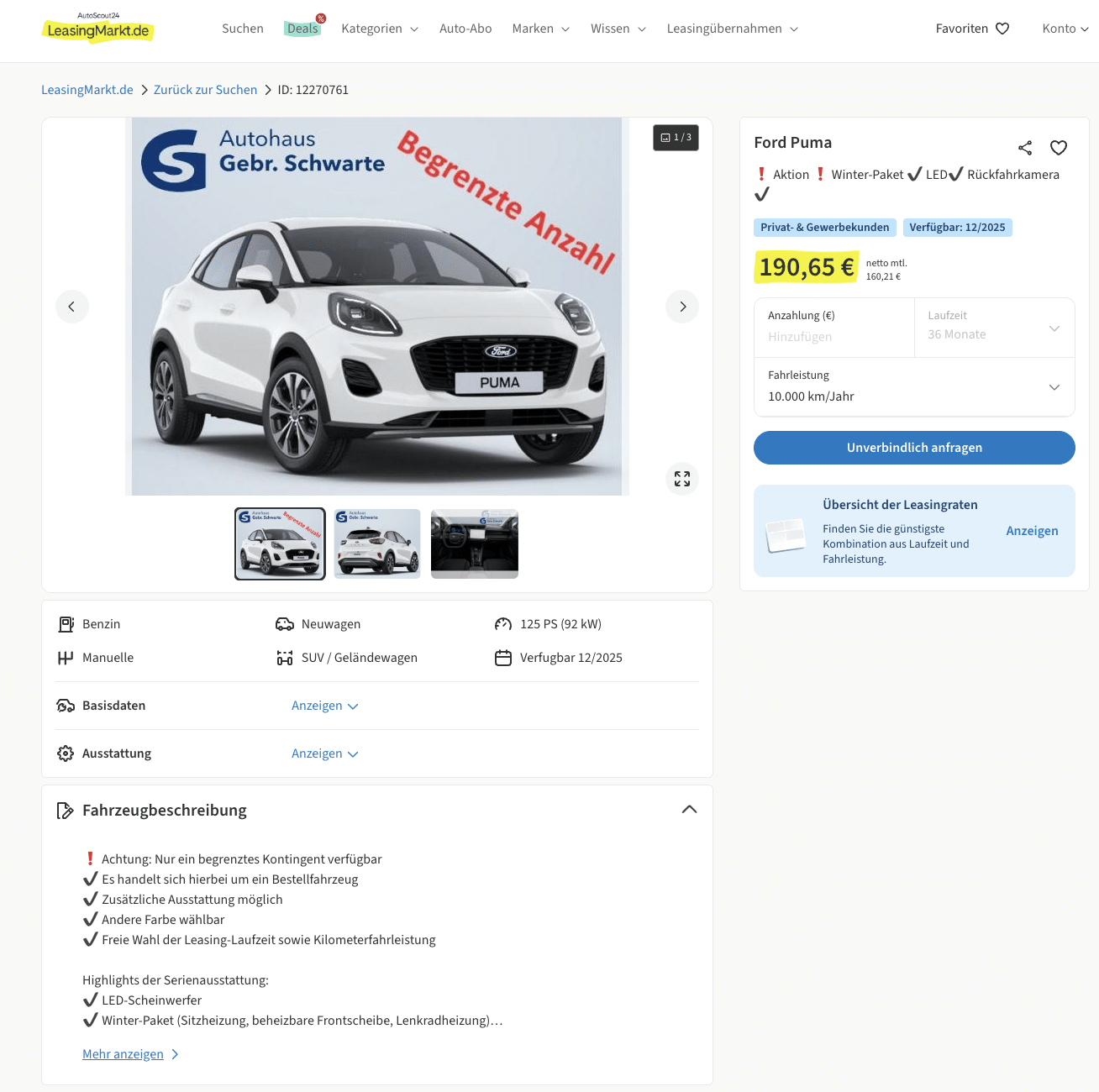 Das Angebot umfasst eine Laufzeit von 36 Monaten mit 10.000 Kilometern pro Jahr, Anpassungen sind möglich. Mit 190,65 Euro brutto im Monat liegt der Puma weit unter Marktniveau, während der Marktführer fast 365 Euro brutto verlangt. Wer sich für dieses SUV entscheidet, fährt nicht nur mit einem stylishen und modernen Fahrzeug, sondern spart auch Monat für Monat bares Geld.