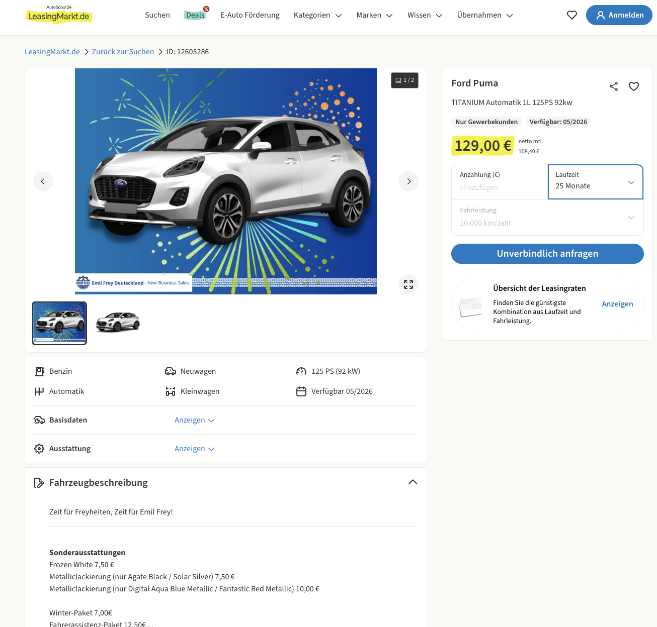 Kalkuliert ist das Angebot mit 25 Monaten Laufzeit und 10.000 Kilometern pro Jahr. Der Vergleich macht den Deal noch auffälliger, denn als Referenz wird genannt, dass der Platzhirsch für den Ford Puma 342 Euro netto pro Monat aufruft.