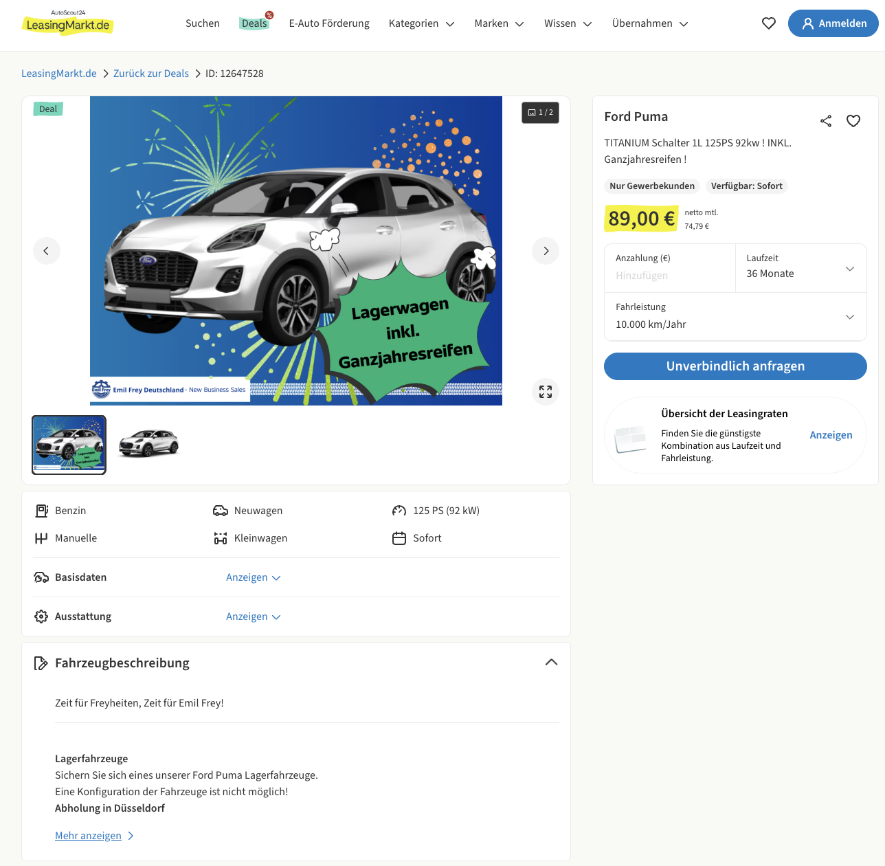 Berechnet wurde das Leasing mit 36 Monaten Laufzeit und 10.000 Kilometern pro Jahr. Mit 74,79 Euro netto monatlich gehört dieses Angebot zu den besonders günstigen Geschäftskunden-Deals in der Klasse der kompakten SUV. Zum Vergleich werden für den Ford Puma beim großen Marktanbieter aktuell rund 267 Euro netto pro Monat verlangt, wodurch sich ein außergewöhnlich großer Preisvorteil ergibt.