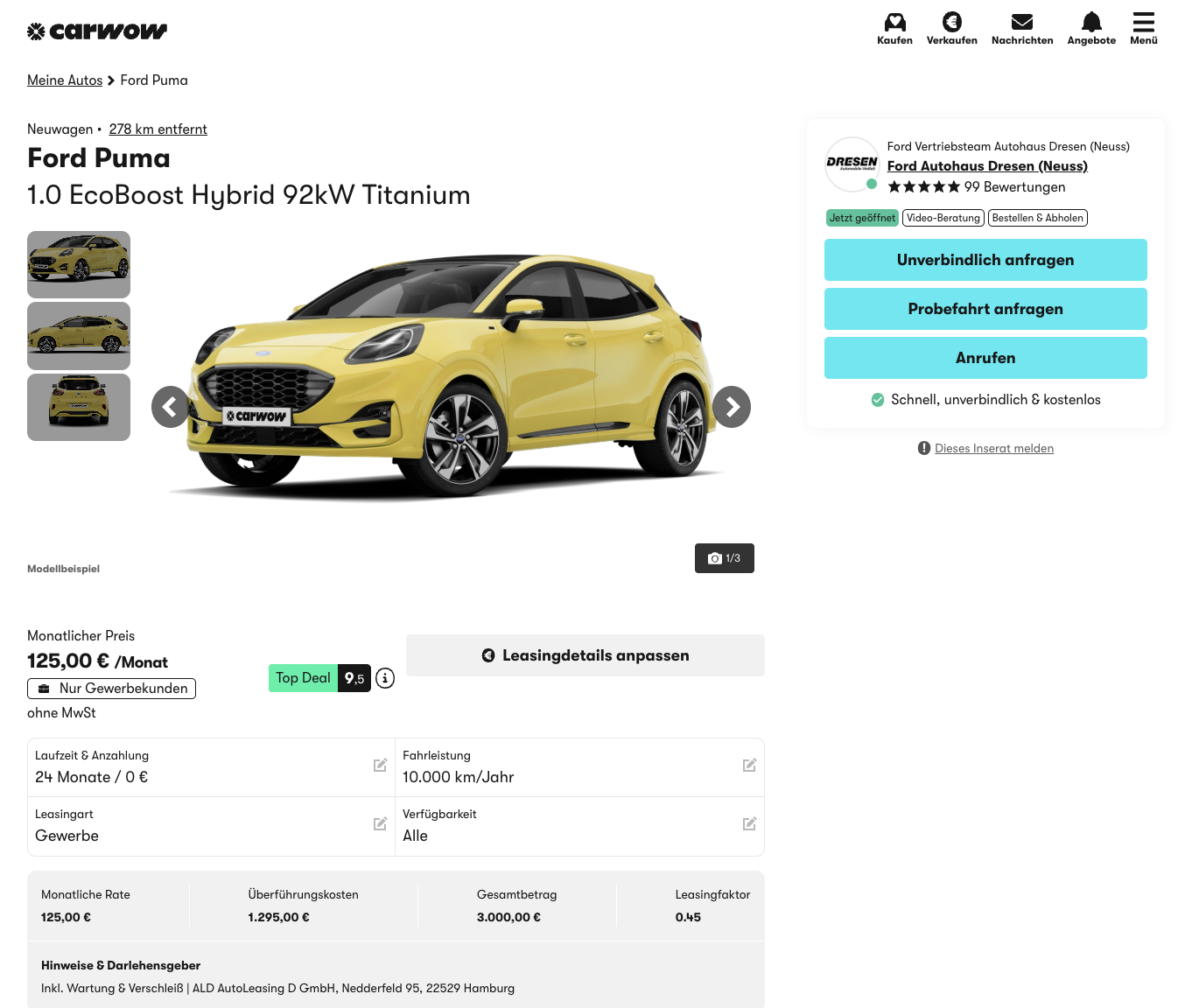 Seine größte Stärke zeigt dieses Angebot im direkten Vergleich. Während ein vergleichbarer Ford Puma beim Platzhirsch aktuell bei rund 315 Euro netto pro Monat liegt, steht dieses Full-Service-Angebot bei nur 125 Euro.