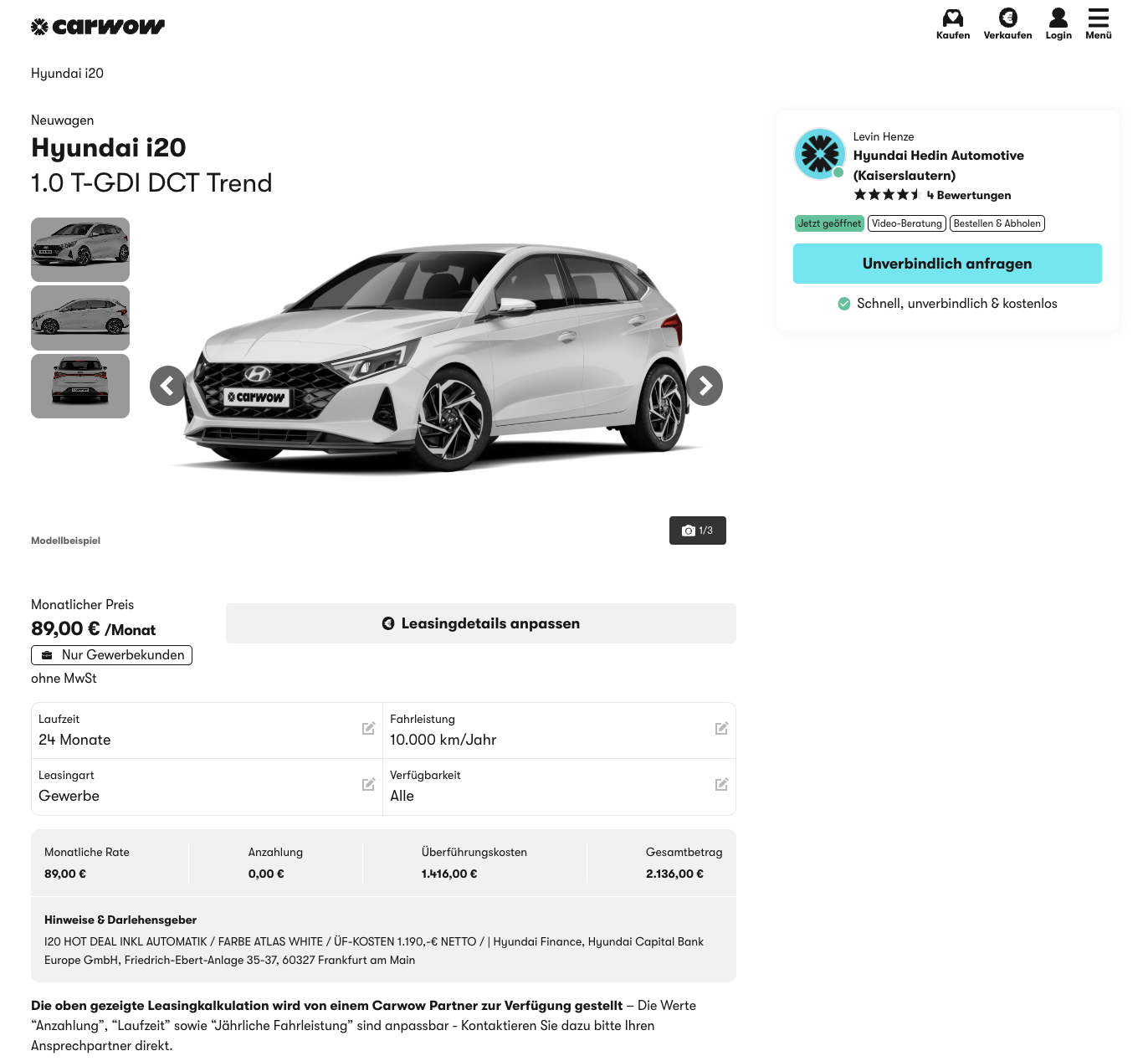 Kalkuliert ist das Angebot von carwow mit 24 Monaten Laufzeit und 10.000 Kilometern pro Jahr, beide Werte lassen sich in der Regel anpassen. Entscheidend ist jedoch der direkte Vergleich. WĂ€hrend andere Anbieter fĂŒr den Hyundai i20 aktuell rund 228 Euro netto pro Monat aufrufen, liegt dieses Angebot mit 89 Euro netto in einer völlig anderen Liga.