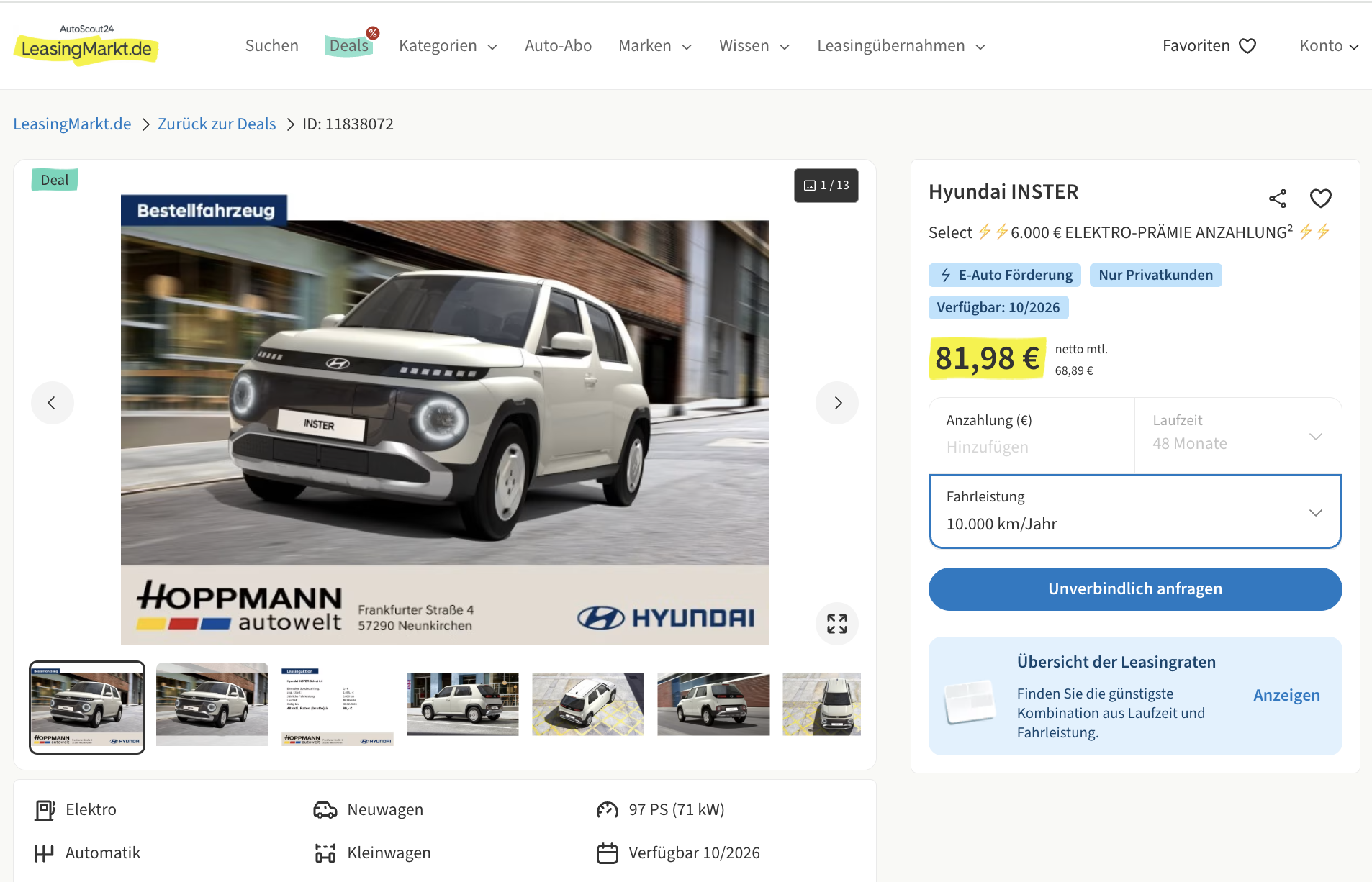 Smarter Elektro-Flitzer zum Super-Preis! Mit dem neuen Hyundai Inster 42 kWh Select gelingt der Umstieg auf Elektromobilität spielend leicht und vor allem überraschend günstig. Bei LeasingMarkt gibt es den cleveren City-Stromer für nur 81,98 Euro brutto im Monat im Privatleasing. Das Fahrzeug ist als frei konfigurierbares Bestellfahrzeug gelistet, das im Oktober 2026 ausgeliefert wird.