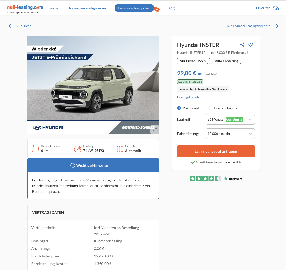 Das Angebot ist auf 36 Monate Laufzeit und 10.000 Kilometer pro Jahr ausgelegt. Im direkten Vergleich wird der Deal besonders deutlich. Der Marktführer verlangt für denselben Hyundai Inster aktuell 126 Euro brutto pro Monat, ebenfalls mit 6.000 Euro Sonderzahlung. Damit positioniert sich dieses Angebot klar günstiger.
