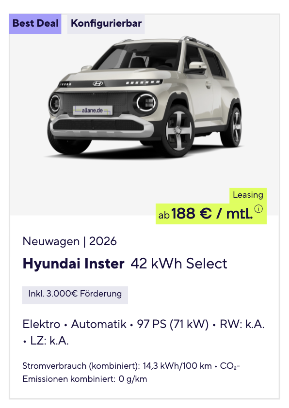 Der Hyundai Inster bringt frischen Wind in die Klasse der kompakten Elektroautos. Hyundai Inster 42 kWh Select bei Allane für 188 Euro brutto im Monat kombiniert niedrige Einstiegskosten mit einem flexiblen Vertragsmodell, das sich klar vom klassischen Leasing abhebt. Kalkuliert wurde das Angebot mit 3.000 Euro Sonderzahlung, 48 Monaten Laufzeit und 10.000 Kilometern pro Jahr. Gleichzeitig handelt es sich um ein frei konfigurierbares Bestellfahrzeug, wodurch sich der Inster individuell zusammenstellen lässt.