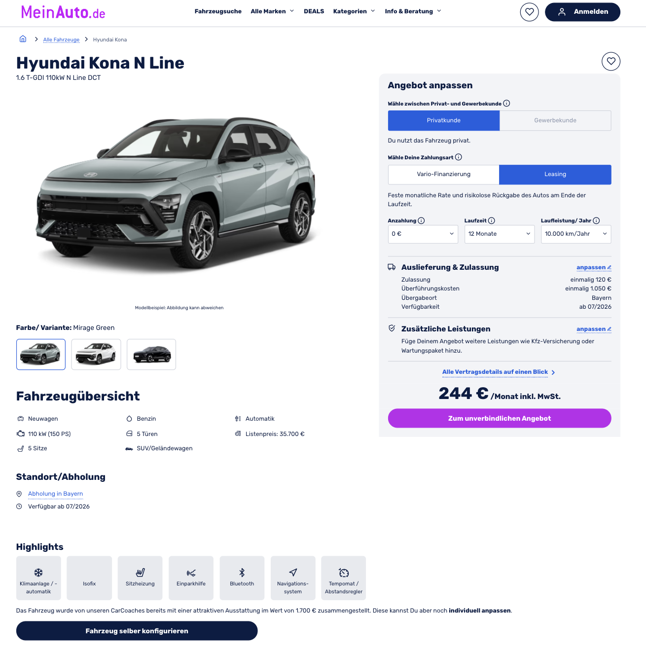 Kalkuliert ist das Angebot mit 12 Monaten Laufzeit und 10.000 Freikilometern pro Jahr. Der Vergleich macht den Deal zusätzlich interessant, denn bei gleicher Ausstattung liegt der Marktführer aktuell bei 378 Euro brutto im Monat. Hier bleibt ihr deutlich darunter und bekommt trotzdem einen Kona N Line, der optisch scharf, digital aufgeräumt und im Alltag angenehm erwachsen fährt.