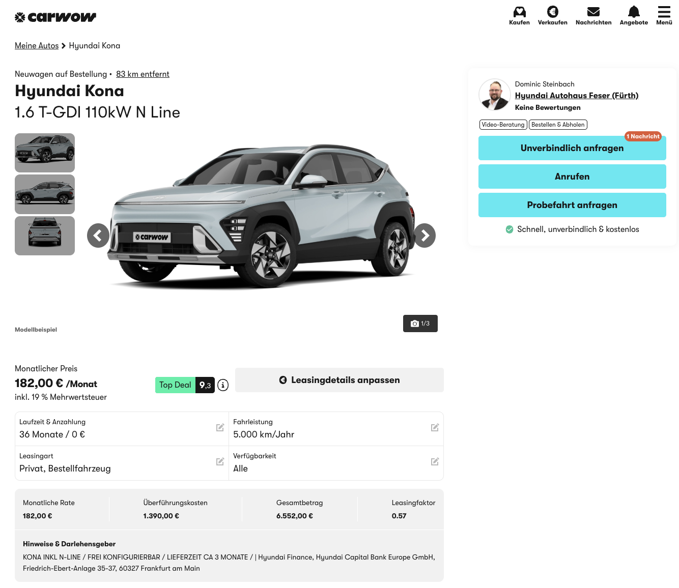 Kompakt-SUV mit Sportoptik zum fairen Tarif. Angeboten wird der Hyundai Kona 1.6 T-GDI 110 kW N Line bei carwow für 182 Euro brutto im Monat und bringt ein gut ausgestattetes Kompakt-SUV zu einer Rate auf den Markt, die in dieser Klasse durchaus attraktiv ist. Das Fahrzeug wird als frei konfigurierbares Bestellfahrzeug angeboten, wodurch Farbe und Ausstattung individuell angepasst werden können. Die Lieferzeit liegt bei rund drei Monaten, was für ein Neufahrzeug vergleichsweise überschaubar ist.