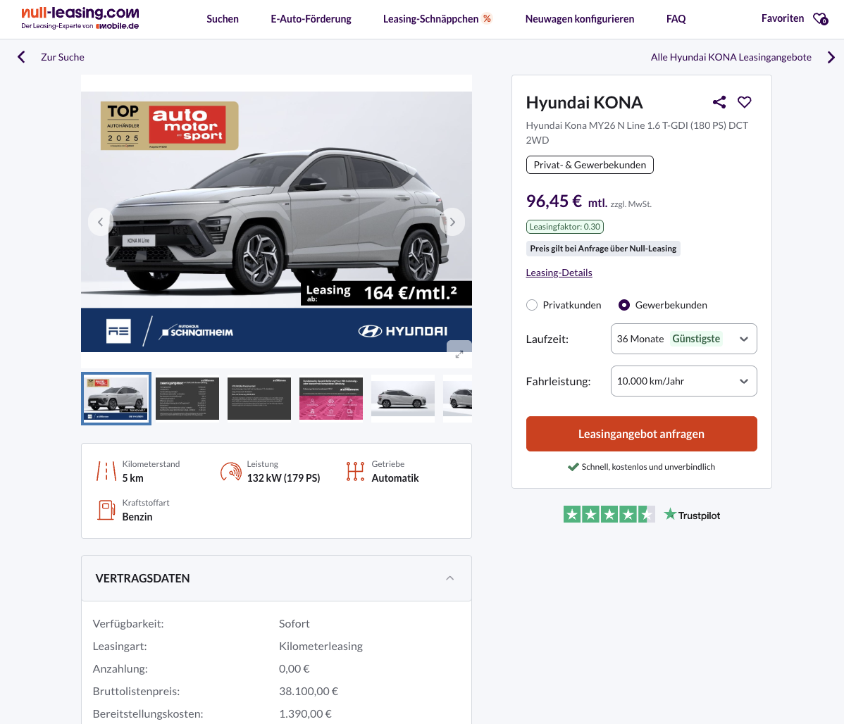 Die Konditionen basieren auf 36 Monaten Laufzeit und 10.000 Kilometern jährlich. Besonders interessant wird das Angebot im Vergleich, denn ähnlich ausgestattete Modelle liegen aktuell bei rund 255 Euro brutto pro Monat. Mit 96,45 Euro netto positioniert sich dieser Deal deutlich darunter und bietet damit einen klaren Preisvorteil für Geschäftskunden.