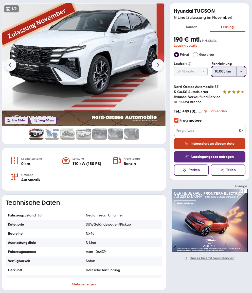 Der Blick über den Tellerrand macht den Vorteil sichtbar, denn der Preis beim Platzhirsch liegt bei 266 Euro brutto im Monat, für den Tucson. Bei mobile.de spart ihr im Vergleich 76 Euro pro Monat.