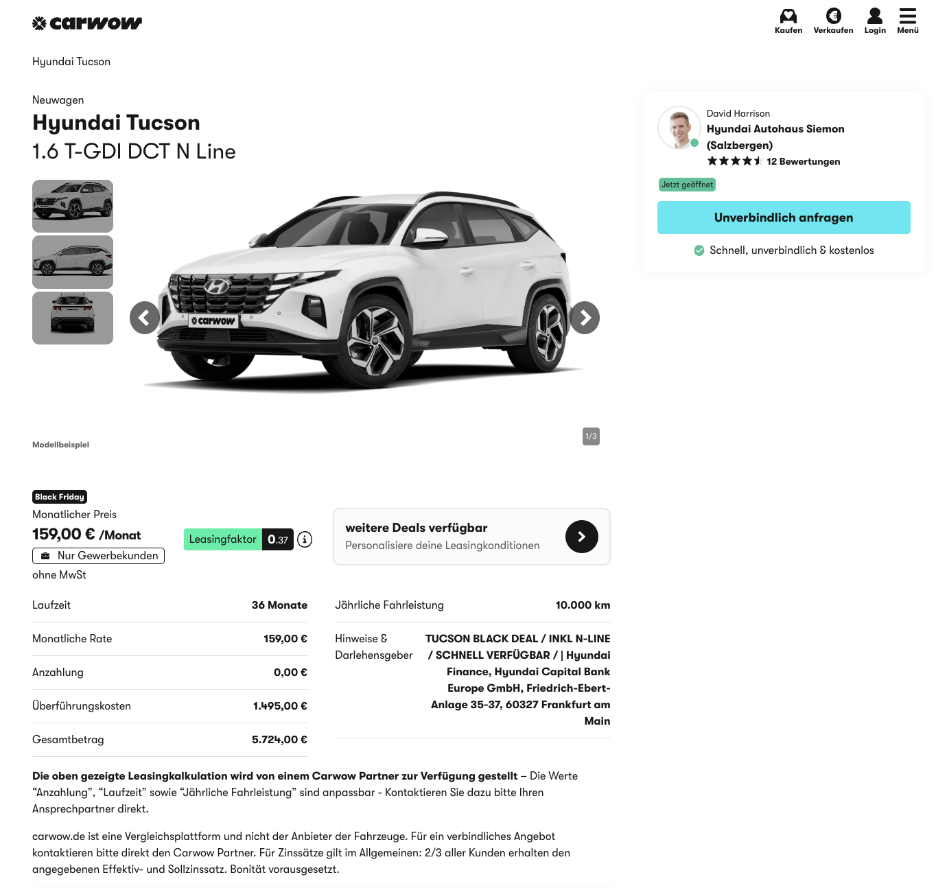 Das Leasing ist auf 36 Monate und 10.000 Kilometer pro Jahr ausgelegt, die Laufleistung lässt sich an euer Profil anpassen. Ein starkes Argument im Hintergrund ist die 5-Jahres-Garantie ohne Kilometerbegrenzung, die Hyundai auf den Tucson gibt. Beim Marktführer würdet ihr für das gleiche Fahrzeug 263 Euro netto pro Monat zahlen. Ein Vergleichangebot mit dem Marktführer zeigt, dass ihr über 100 Euro bei carwow spart, denn der Platzhirsch verlangt 263 Euro netto pro Monat.
