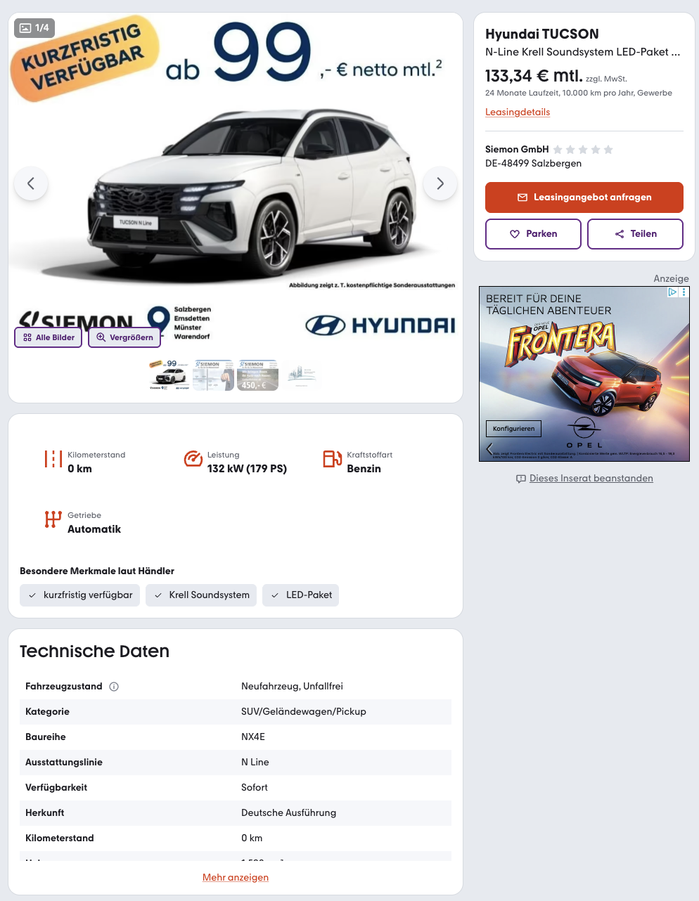 Kalkuliert ist das Geschäftsleasing auf 24 Monate Laufzeit und 10.000 Kilometer pro Jahr, Anpassungen sind möglich. Der Vergleich spricht für sich. Während ein vergleichbarer Hyundai Tucson beim Marktführer aktuell rund 306 Euro netto pro Monat kostet, liegt dieses Angebot bei 133,34 Euro netto. Wer einen sofort verfügbaren Allrad-SUV mit starker Ausstattung sucht, bekommt hier eines der aktuell attraktivsten Tucson-Angebote am Markt.