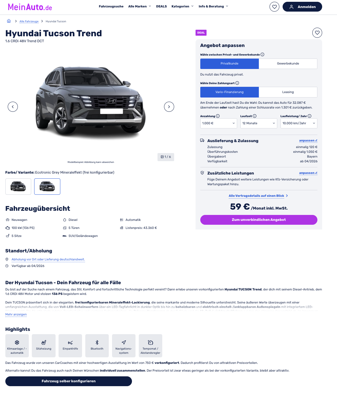 Zum ◼ Black Friday ◼ gibt es den Hyundai Tucson 1.6 T-GDI 48V DCT Trend bei MeinAuto für 59 Euro im Monat brutto, kalkuliert mit 1.000 Euro Anzahlung, 12 Monaten Laufzeit und 10.000 Freikilometern. Wer die Sonderzahlung sparen möchte, landet bei 143 Euro brutto im Monat. Es handelt sich um eine Bestellaktion, das heißt, ihr stellt euch euren Tucson nach Geschmack zusammen, statt ein vorgegebenes Paket zu nehmen.