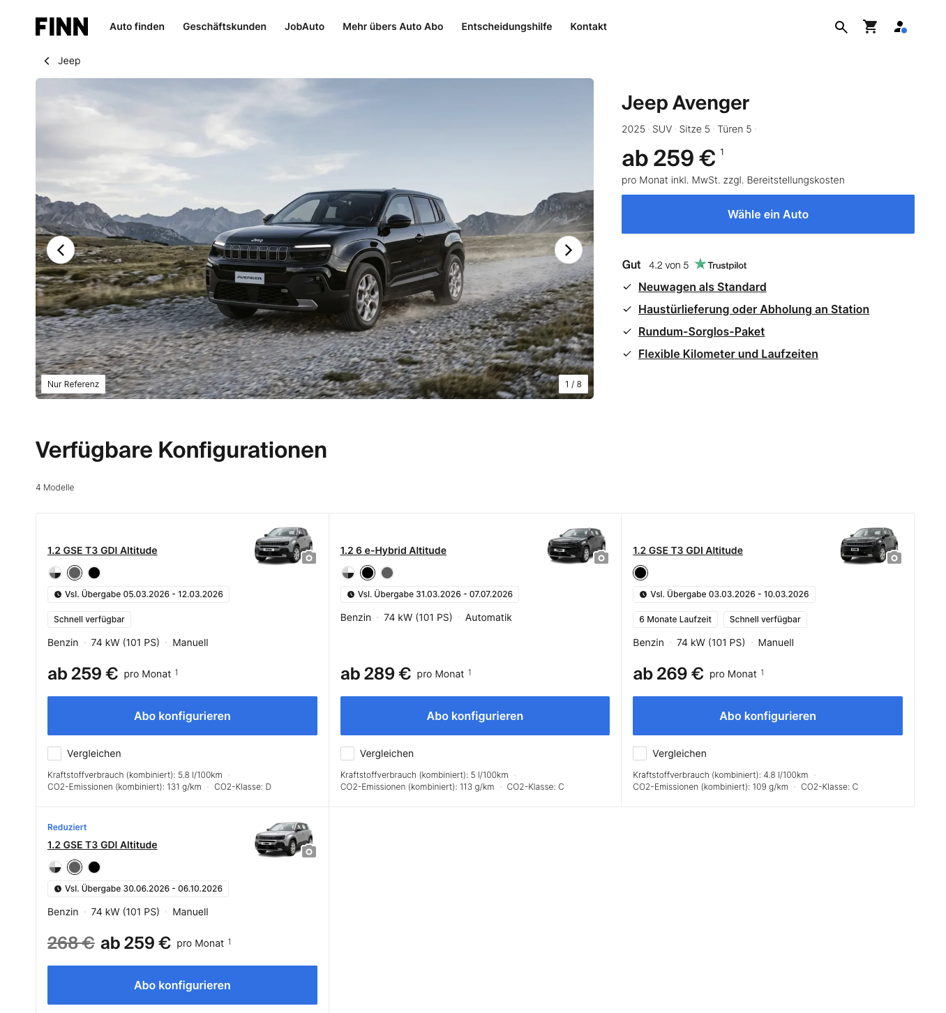 Der Jeep Avenger bringt den typischen SUV-Charakter der Marke in ein kompaktes und alltagstaugliches Format. Jeep Avenger 1.2 GSE T3 GDI bei FINN für 259 Euro brutto pro Monat wird aktuell als All-inclusive Auto-Abo angeboten und eignet sich besonders für alle, die ein SUV flexibel nutzen möchten. Das Fahrzeug steht in Storm Grey Uni bereit und ist im Zeitraum vom 05.03.2026 bis 12.03.2026 verfügbar, wodurch sich der Einstieg kurzfristig planen lässt.