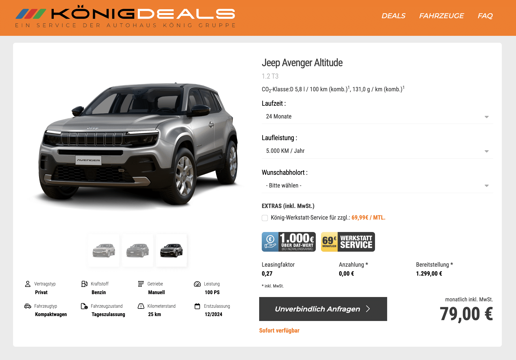 Günstiger einsteigen und sofort fahren! Bei KÖNIGDEALS gibt es den Jeep Avenger als Tageszulassung bereits ab 79 Euro brutto pro Monat (bei 5.000 km/Jahr). Wer 10.000 km/Jahr benötigt, liegt mit nur 101 Euro brutto pro Monat immer noch extrem günstig. Der Wagen wurde im Dezember 2024 zugelassen und hat erst ca. 25 km auf dem Tacho, faktisch neu, mit allen Vorteilen der Tageszulassung.