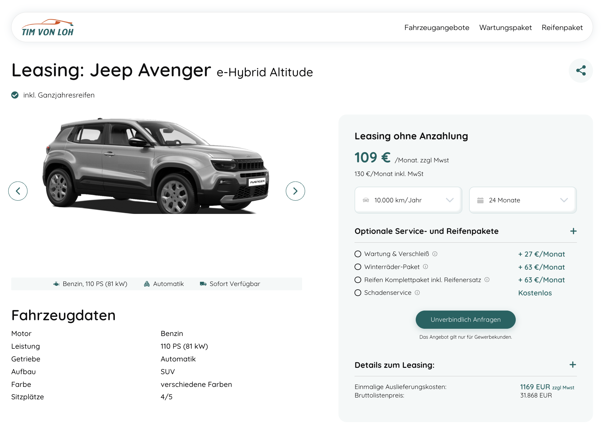 Die Kalkulation basiert auf 24 Monaten Laufzeit und 10.000 Kilometern pro Jahr, beide Parameter sind anpassbar. Besonders interessant wird das Angebot im direkten Vergleich. Während der Platzhirsch für den Jeep Avenger aktuell rund 189 Euro netto pro Monat aufruft, liegt dieses Geschäftsleasing bei 109 Euro netto. Das bedeutet eine Ersparnis von 80 Euro monatlich, hochgerechnet auf die Laufzeit ein klar spürbarer Vorteil.