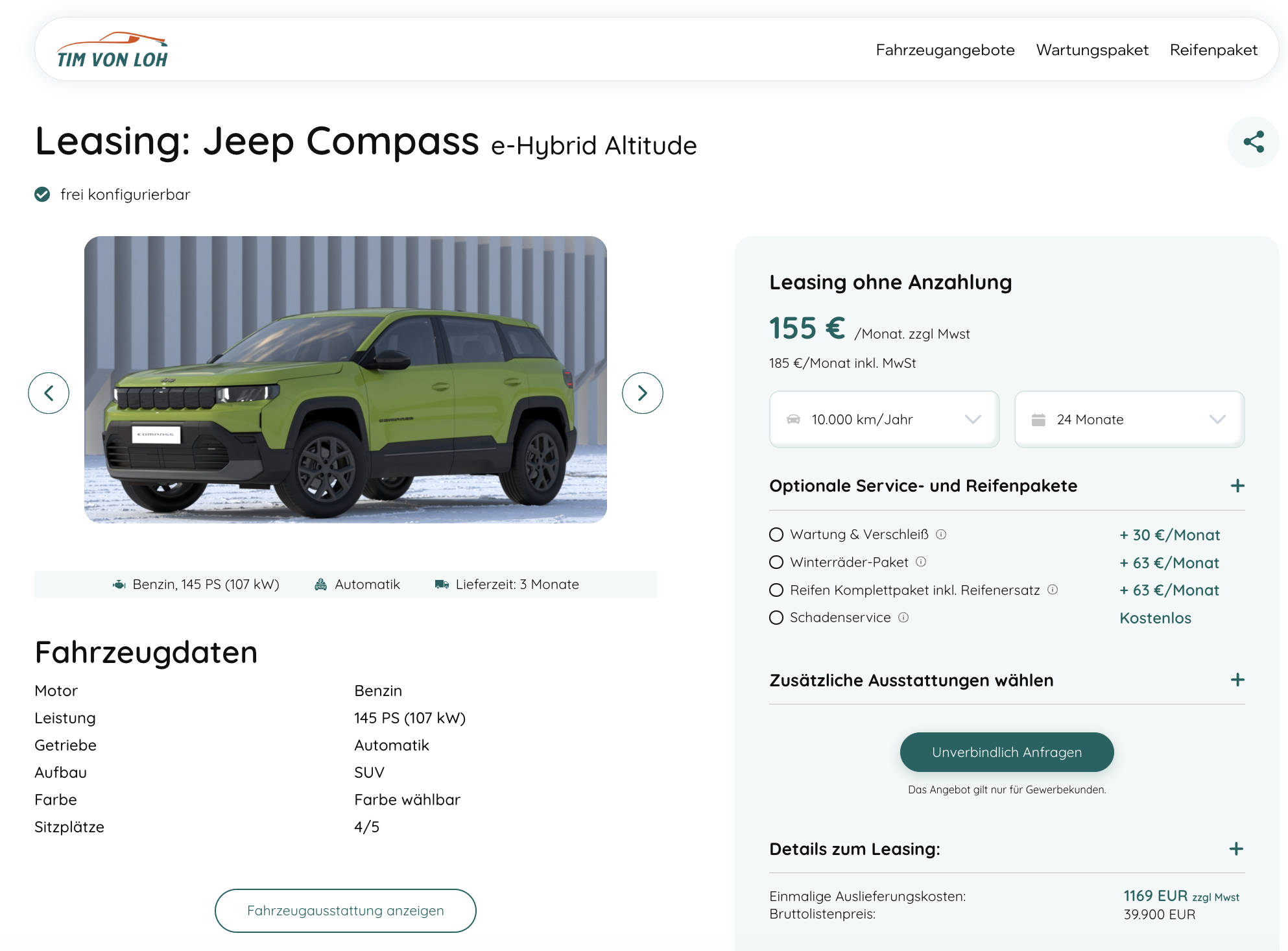 Der Jeep Compass verbindet klassische SUV-Gene mit moderner Hybridtechnik und zeigt, dass robuste Optik und effiziente Antriebe heute problemlos zusammenpassen. Jeep Compass 1.2 DCT6 e-Hybrid Altitude bei Tim von Loh für 155 Euro netto pro Monat ist aktuell ein attraktives Geschäftsleasing für alle, die ein kompaktes SUV mit moderner Technik suchen. Das Angebot läuft als Bestellfahrzeug, sodass Ausstattung und Farbe individuell gewählt werden können. Die Lieferzeit liegt bei rund drei Monaten, wodurch der Einstieg vergleichsweise schnell möglich ist.