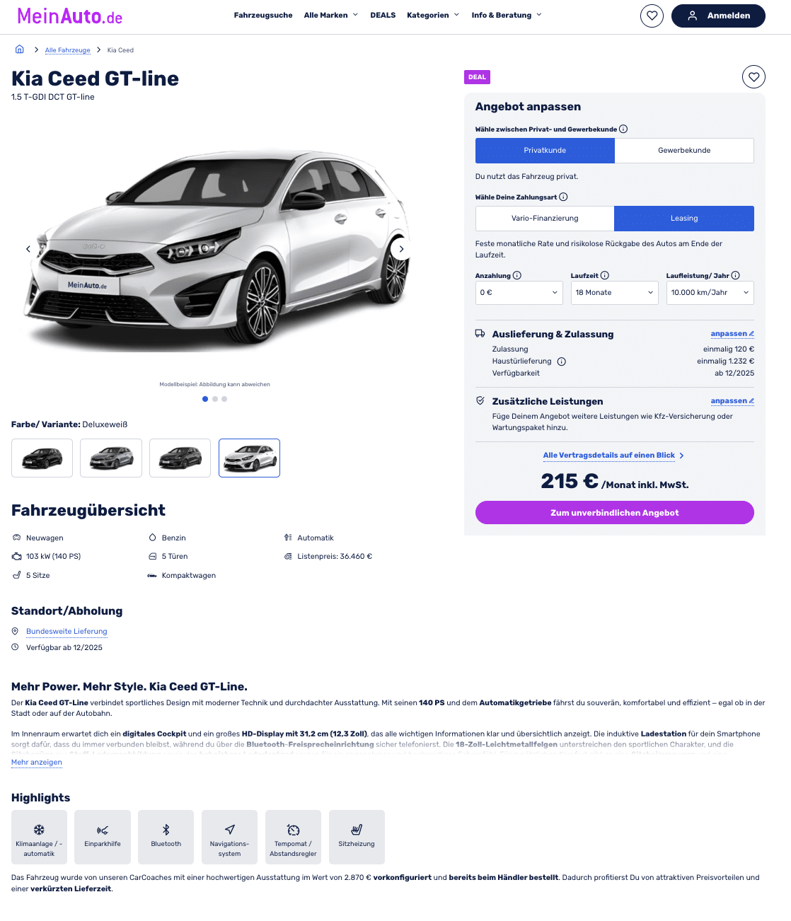 Der Deal wurde mit einer Laufzeit von 18 Monate und 10.000 km Laufleistung pro Jahr berechnet und lässt sich optional anpassen. Beim Marktführer ist der Kia Ceed aktuell nicht verfügbar.