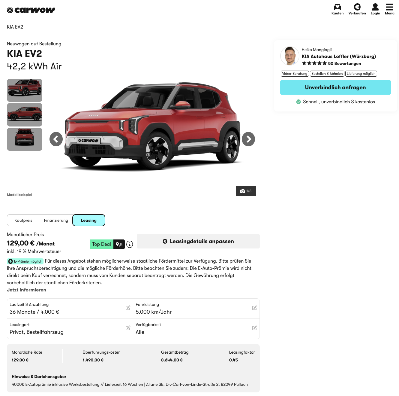 Der EV2 ist das kleinste E-FAhrzeug von Kia. Bei carwow gibt es den Kia EV2 42,2 kWh Air bereits für 129 Euro brutto pro Monat, kalkuliert mit einer Sonderzahlung von 4.000 Euro, die als erstattungsfähige Umweltprämie angesetzt ist. Damit wird der Einstieg besonders attraktiv, denn je nach Förderfähigkeit kann ein Teil oder sogar der gesamte Betrag zurückfließen. Realistisch gerechnet ergibt sich daraus eine normalisierte Leasingrate von 240,11 Euro im Monat. Gleichzeitig bleibt das Fahrzeug frei konfigurierbar, also kein starres Lagerangebot, sondern individuell anpassbar.