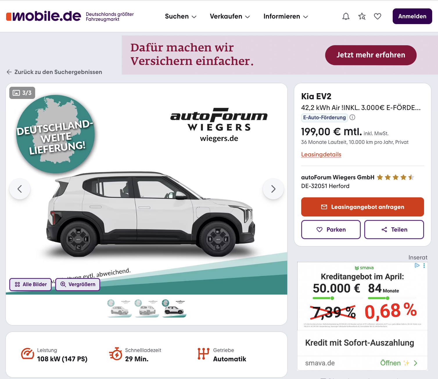 Das Angebot umfasst eine Laufzeit von 36 Monaten und eine jährliche Kilometerleistung von 10.000 Kilometern. Wem 5.000 Kilometer pro Jahr reichen, der zahlt mit 179 Euro bei gleicher Anzahlung nochmal weniger. Besonders interessant ist, dass der EV2 beim Marktführer derzeit noch nicht bestellbar ist.