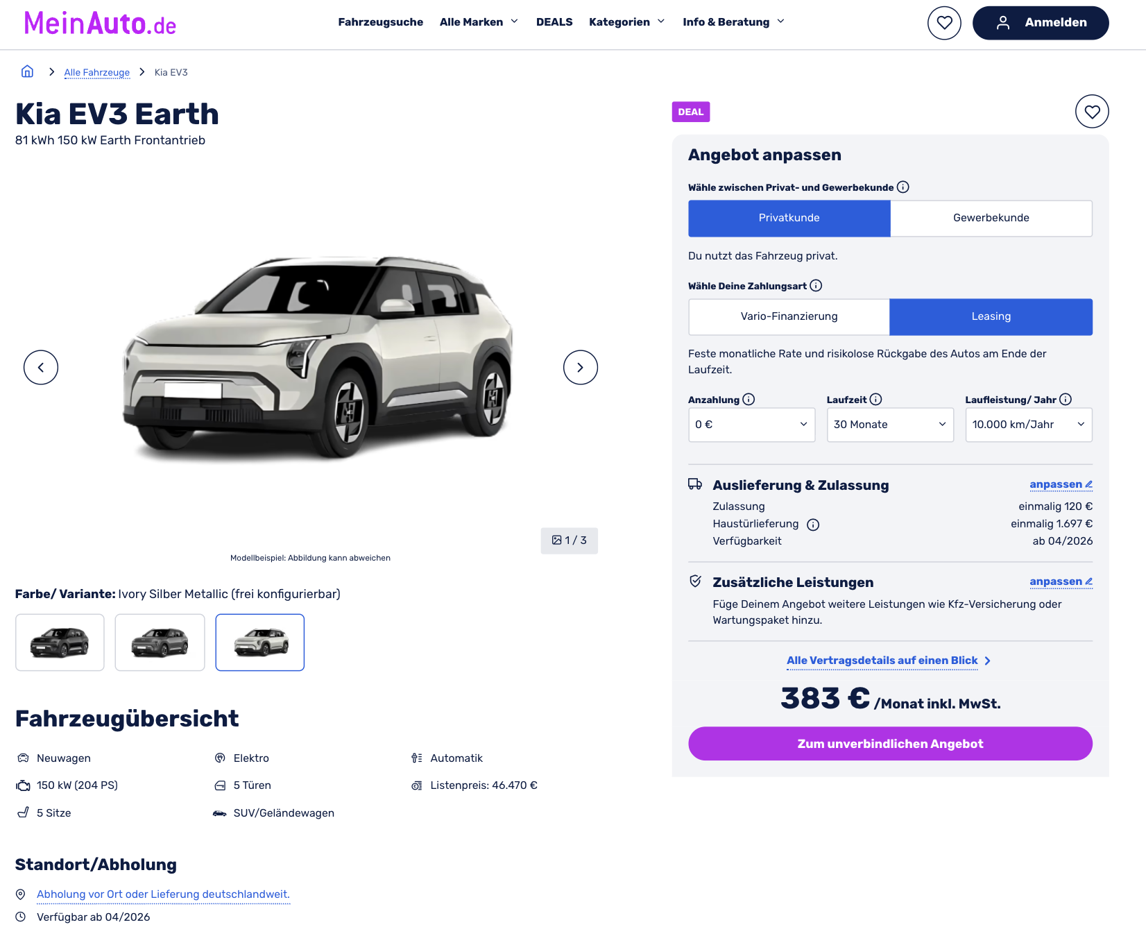 Der Vergleich ist deutlich, während der Marktführer für den Kia EV3 mit gleicher Konfiguration 554 Euro brutto im Monat aufruft, zahlt ihr hier 383 Euro. Das bedeutet 171 Euro Ersparnis pro Monat bei identischer Technik und Ausstattung.