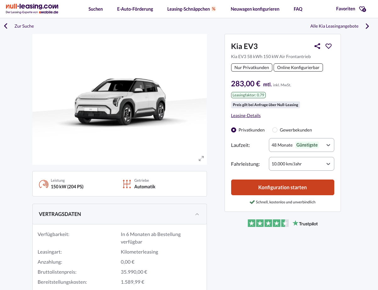 Kia-Fans aufgepasst! Null-Leasing hat den brandneuen Kia EV3 58 kWh 150 kW Air schon für 283 Euro brutto im Monat im Privatleasing-Angebot.