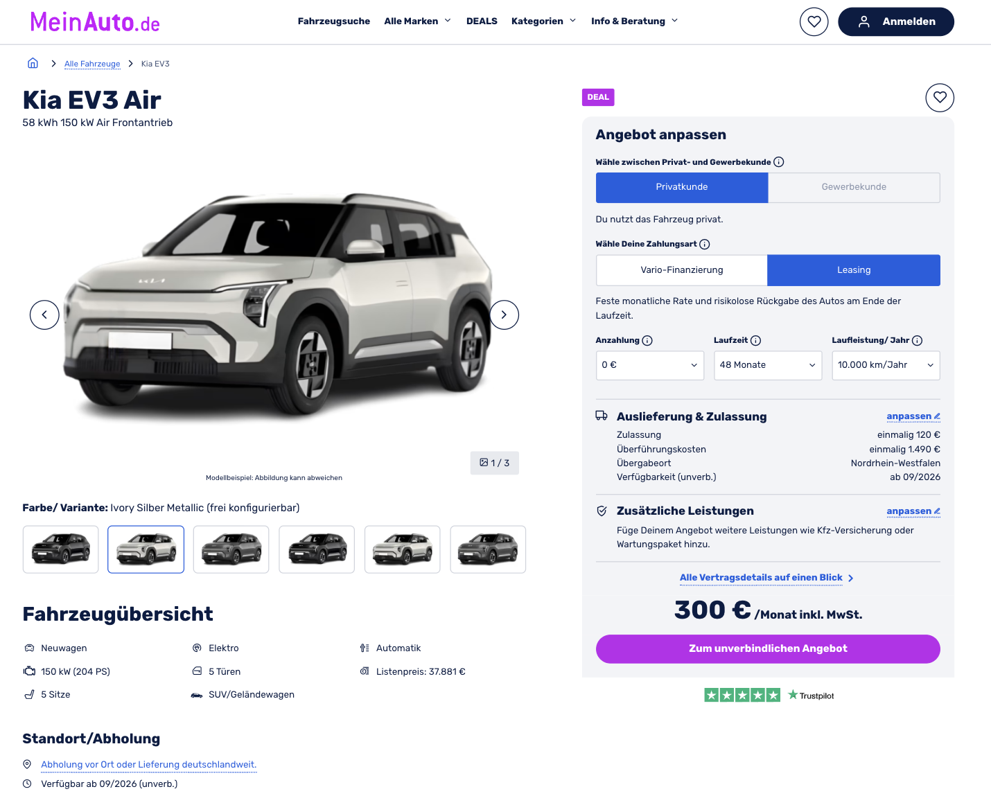 Kia EV3 mit zwei Optionen bei MeinAuto leasen. Den Kia EV3 58 kWh 150 kW Air gibt es ohne Umweltprämie und auf MeinAuto zugelassen für 300 Euro brutto pro Monat. Alternativ lässt sich die monatliche Rate weiter senken, mit 3.000 Euro Sonderzahlung sinkt die Rate auf 269 Euro brutto und das Fahrzeug wird auf euch zugelassen. Angeboten wird ein frei konfigurierbares Bestellfahrzeug, die Verfügbarkeit ist aktuell für September 2026 vorgesehen.