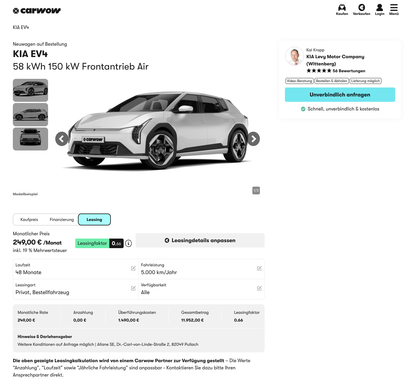 Der Kia EV4 richtet sich an alle, die ein modernes Elektroauto suchen, das im Alltag funktioniert und dabei preislich überschaubar bleibt. Kia EV4 58 kWh 150 kW Frontantrieb Air bei carwow für 249 Euro brutto im Monat im Privatleasing ist ein Angebot, das vor allem durch die Kombination aus sinnvoller Ausstattung und einer klar kalkulierbaren Rate überzeugt. Angeboten wird ein frei konfigurierbares Bestellfahrzeug, wodurch sich Farbe und Optionen passend zum eigenen Bedarf zusammenstellen lassen.