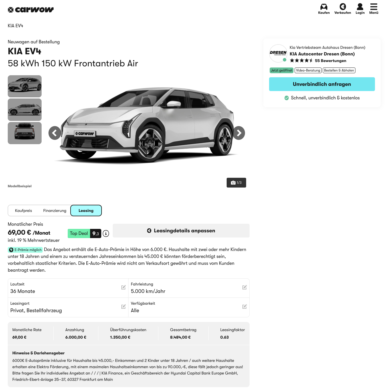 Die 6.000 Euro Sonderzahlung werden von carwow im Voraus angesetzt, weil der EV4 grundsätzlich für die Umweltprämie qualifiziert ist. Nach Zulassung und erfolgreicher Beantragung können bis zu 6.000 Euro erstattet werden, je nach Staffelung und Voraussetzungen. Für den Vergleich mit anderen Leasingangeboten ist deshalb die normalisierte Rate wichtig. Rechnet man die Prämie über die Laufzeit um, kommt man auf eine normalisierte Leasingrate von 235,67 Euro brutto pro Monat. Damit bleibt das Angebot transparent, und man sieht sofort, wo es preislich wirklich liegt, unabhängig davon, ob die Prämie vollständig zurückkommt.