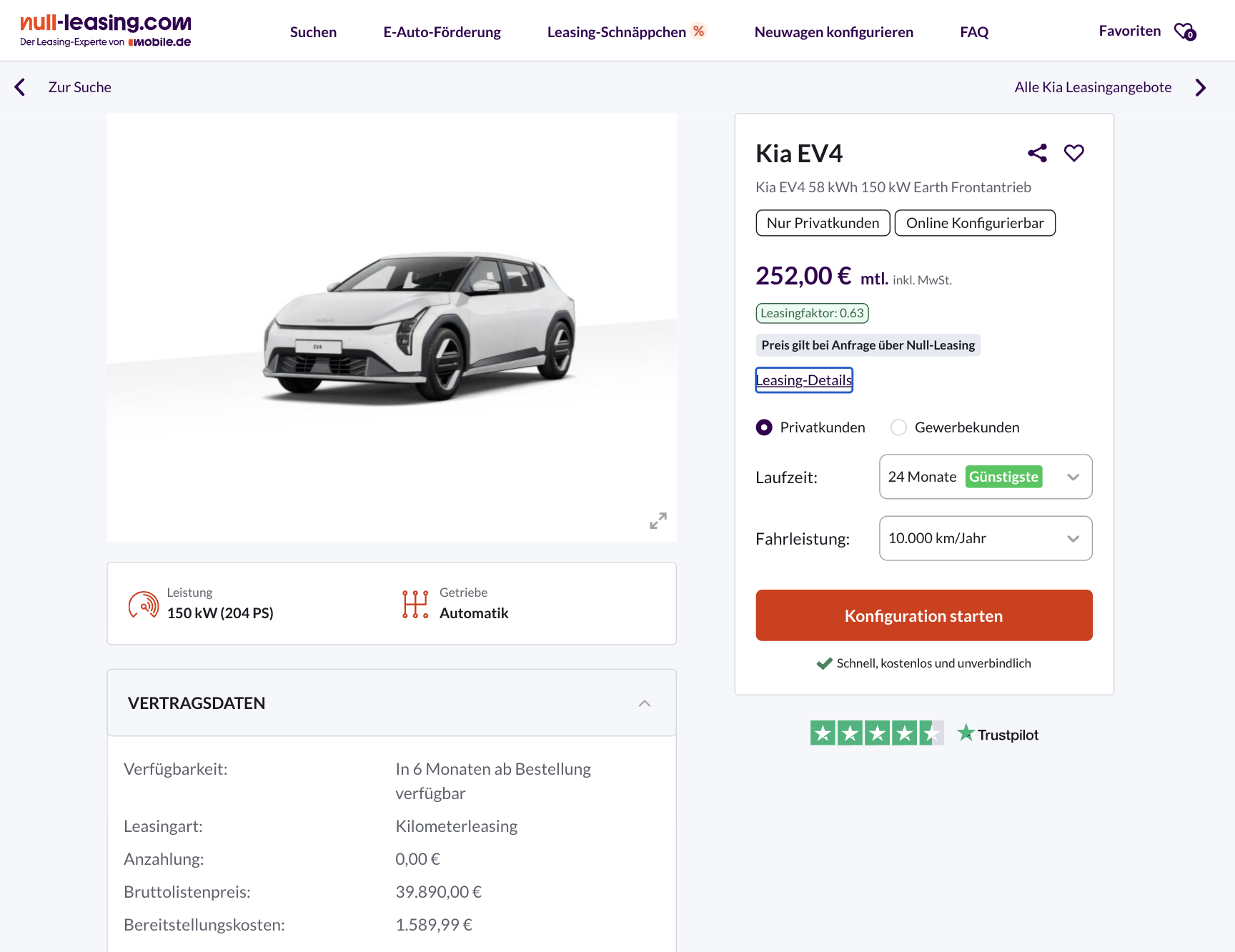 Der Kia EV4 markiert den Einstieg von Kia in die neue elektrische Kompaktklasse. Bei Null-Leasing können Privatkunden den Kia EV4 58 kWh 150 kW Earth für 252 Euro brutto pro Monat leasen, kalkuliert mit 24 Monaten Laufzeit und 10.000 Kilometern pro Jahr. Wichtig: keine Vorleistung einer Umweltprämie, die Rate steht so im Vertrag. Es handelt sich um ein Bestellfahrzeug mit rund sechs Monaten Lieferzeit.