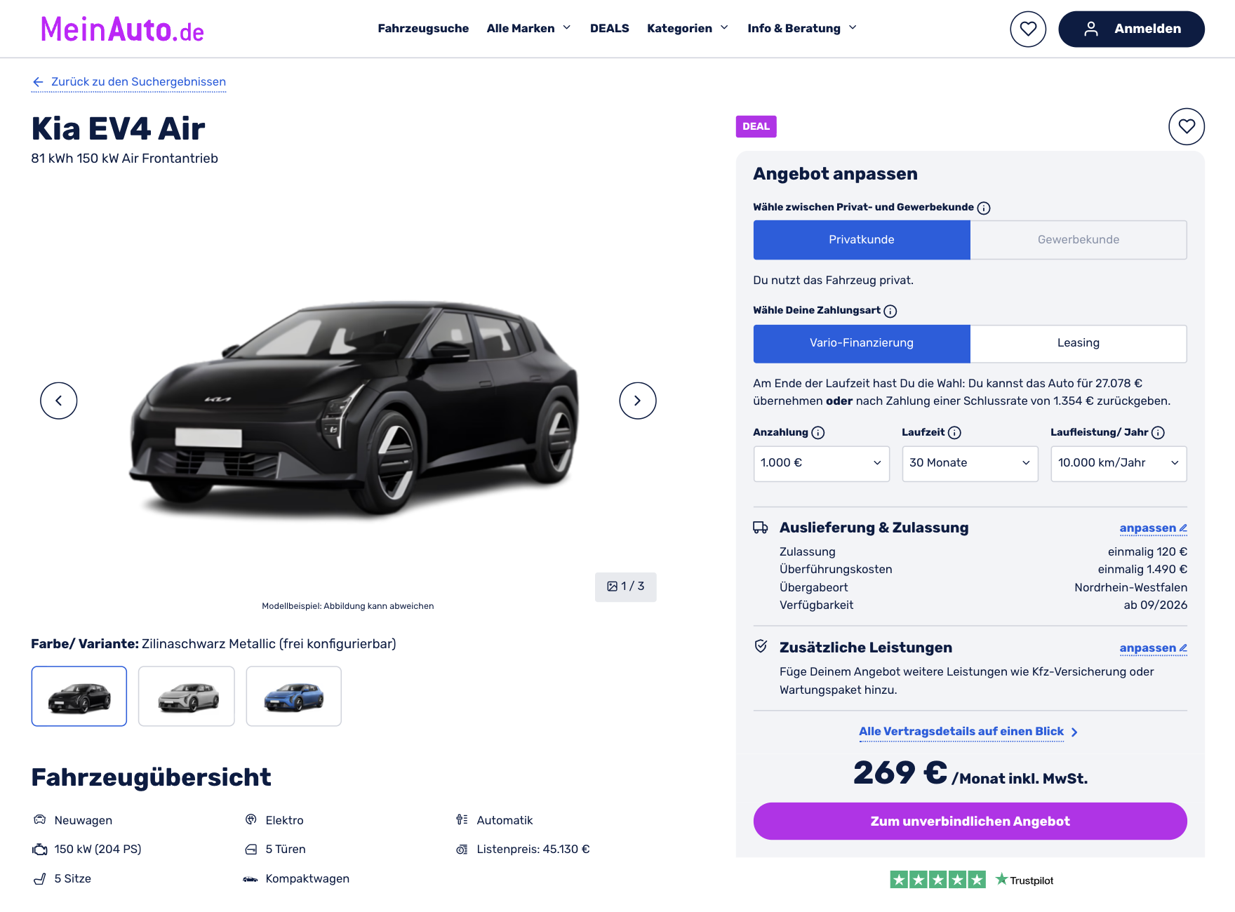 Elektrischer Kia für die Langstrecken. Der Kia EV4 81 kWh 150 kW Air bei MeinAuto für 269 Euro brutto im Monat bringt ein Konzept auf die Straße, das aktuell besonders gefragt ist, ein kompaktes Elektroauto mit echter Reichweite und gleichzeitig flexiblen Vertragsbedingungen. Das Modell wird im Vario-Leasing mit 1.000 Euro Sonderzahlung angeboten und bleibt dabei vollständig konfigurierbar. Die Auslieferung ist für September 2026 vorgesehen, was genügend Spielraum für individuelle Anpassungen lässt.