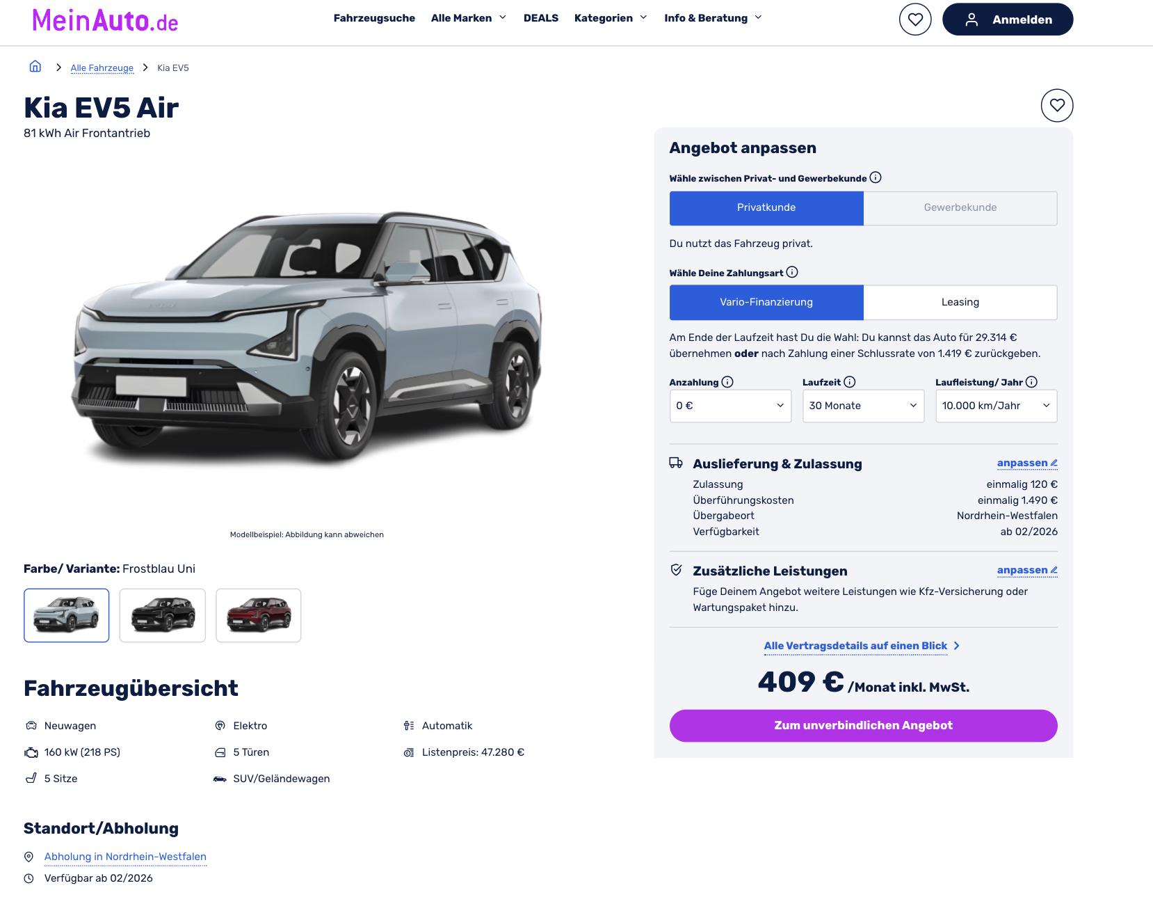 Kalkuliert ist das Angebot mit 30 Monaten Laufzeit und 10.000 Kilometern pro Jahr. Die monatliche Rate von 409 Euro brutto bleibt gut planbar, während das Vario-Leasing am Ende maximale Entscheidungsfreiheit bietet. Da beim Marktführer aktuell kein öffentlicher Preis für den Kia EV5 ausgewiesen ist, lässt sich kein direkter Vergleich ziehen, das Angebot steht damit für sich und richtet sich an alle, die ein modernes Elektro-SUV mit viel Flexibilität suchen.