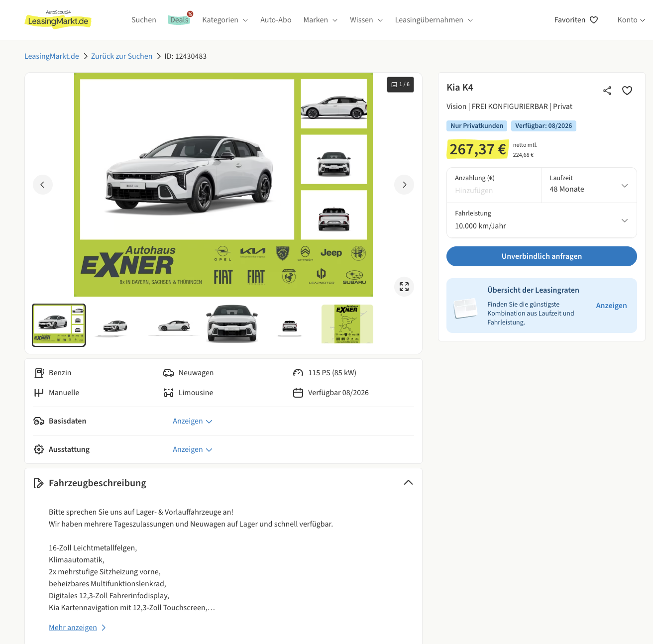 Das Leasingangebot ist auf 48 Monate Laufzeit und 10.000 Kilometer pro Jahr kalkuliert. Beide Werte lassen sich in der Regel anpassen, falls sich das persönliche Fahrprofil unterscheidet. Ein direkter Marktvergleich ist aktuell nicht möglich, da der Kia K4 beim Marktführer noch nicht gelistet ist.