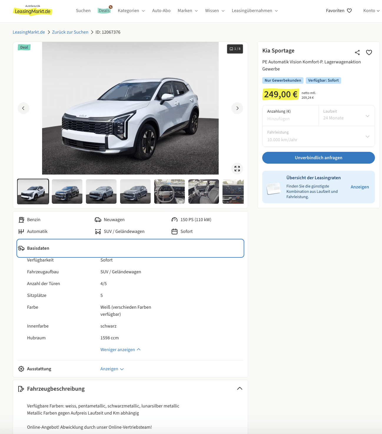 Das Angebot ist auf 24 Monate Laufzeit und 10.000 Kilometer jährlich ausgelegt, lässt sich aber flexibel anpassen. Besonders attraktiv wird der Deal beim Blick auf den Markt: Während der Platzhirsch aktuell rund 399 Euro netto pro Monat verlangt, zahlt ihr hier fast die Hälfte.