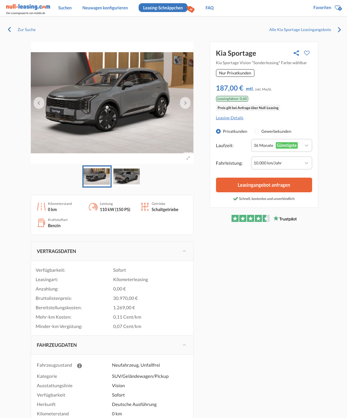 Kalkuliert ist das Angebot auf 36 Monate und 10.000 Kilometer pro Jahr. Während das vergleichbare Angebote vom Platzhirsch bei 277 Euro brutto im Monat liegen, positioniert sich dieses Leasing mit 187 Euro brutto deutlich darunter.