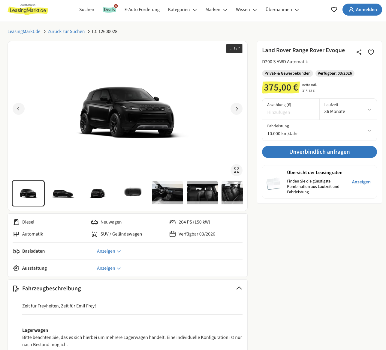 Das Leasingangebot ist auf 36 Monate Laufzeit und 10.000 Kilometer pro Jahr kalkuliert, beide Werte lassen sich bei Bedarf anpassen. Besonders interessant wird das Angebot durch den Marktvergleich. Da der aktuelle Marktführer Fahrzeuge der Marke Land Rover derzeit nicht anbietet, eröffnet sich hier eine seltene Gelegenheit, einen Range Rover Evoque zu einer monatlichen Rate zu fahren, die im Premiumsegment als ausgesprochen fair einzuordnen ist.