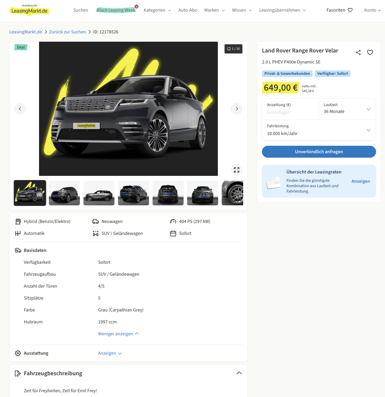 Dieses Angebot wurde mit einer Laufzeit von 36 Monaten und 10.000 Kilometer Fahrleistung pro Jahr berechnet. Wer ein Design orientiertes Premium-SUV mit Plug-in-Hybrid, Allrad, starkem Systemleistungspaket und hochwertigem Innenraum sucht, findet im Land Rover Range Rover Velar P400e Dynamic SE die perfekte Lösung.