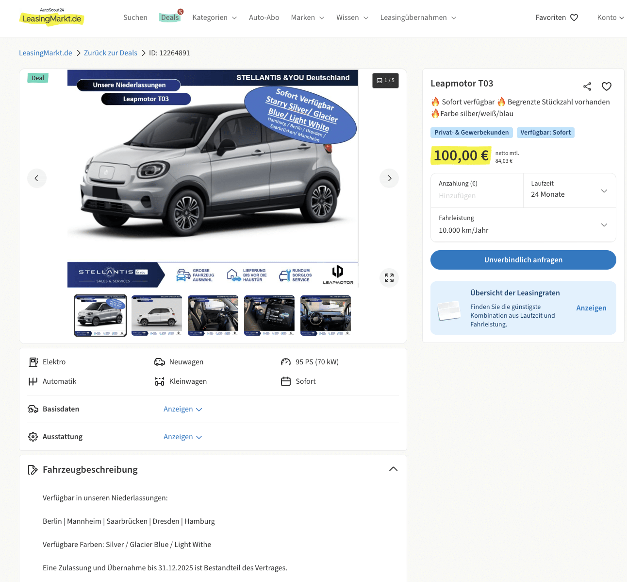 LeasingMarkt macht vollelektrische City-Mobilität plötzlich sehr einfach, denn der Leapmotor T03 37,3 kWh 70 kW steht dort als sofort verfügbarer Lagerwagen bereits für 100 Euro brutto im Monat. Das Angebot gilt für Privat- sowie Gewerbekunden. Die Zulassung und Übernahme bis zum 31.12.2025 ist Vertragsbestandteil und die Abholung ist in Berlin, Mannheim, Saarbrücken, Dresden oder Hamburg möglich. Bei der Optik habt ihr die Wahl, Silver, Glacier Blue oder Light White setzen in der Stadt einen frischen Akzent, ohne aufdringlich zu wirken.
