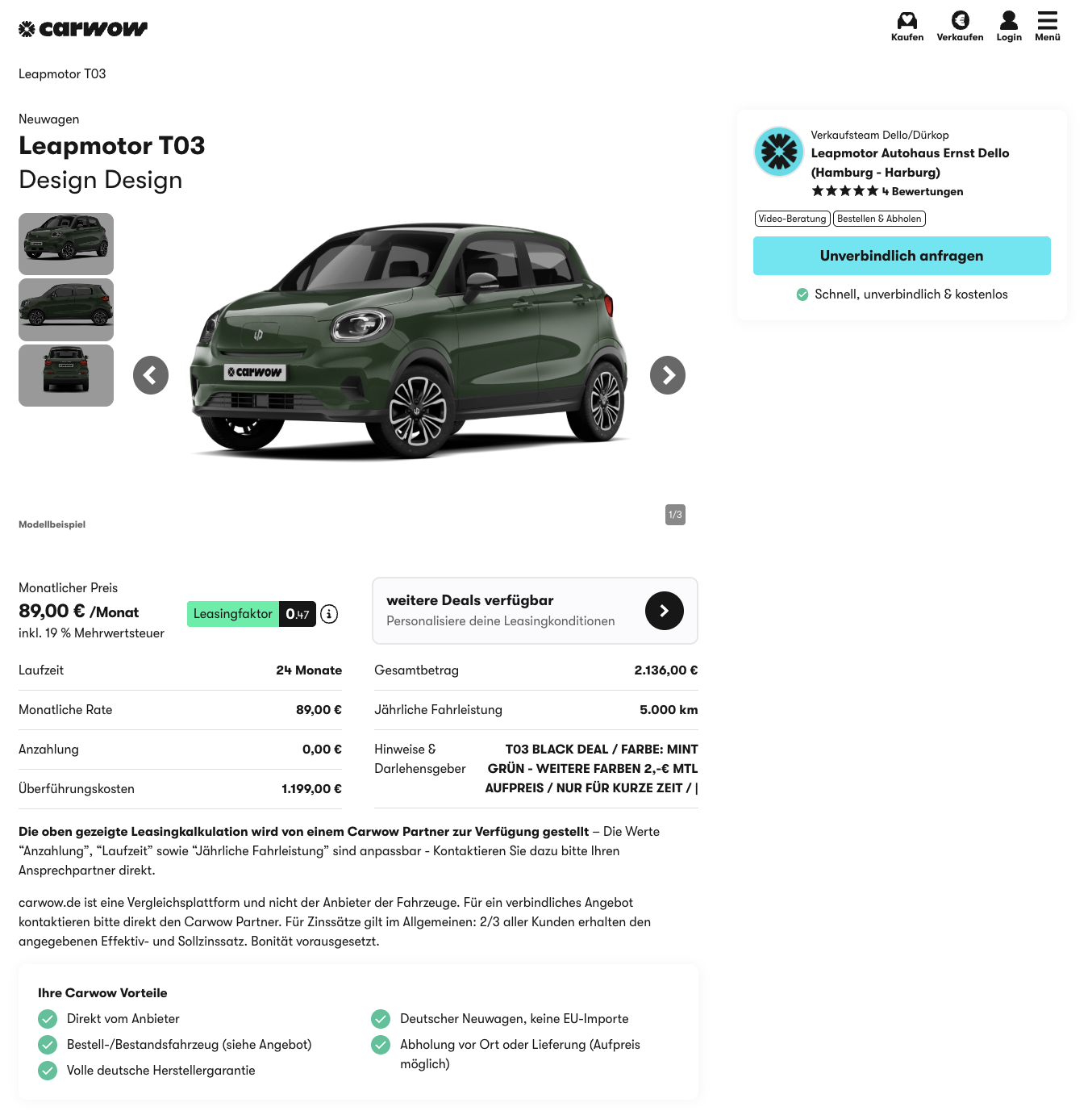 Beim Marktführer ist Leapmotor derzeit nicht gelistet, was dieses Paket zu einer preislich wie zeitlich attraktiven Alternative macht.