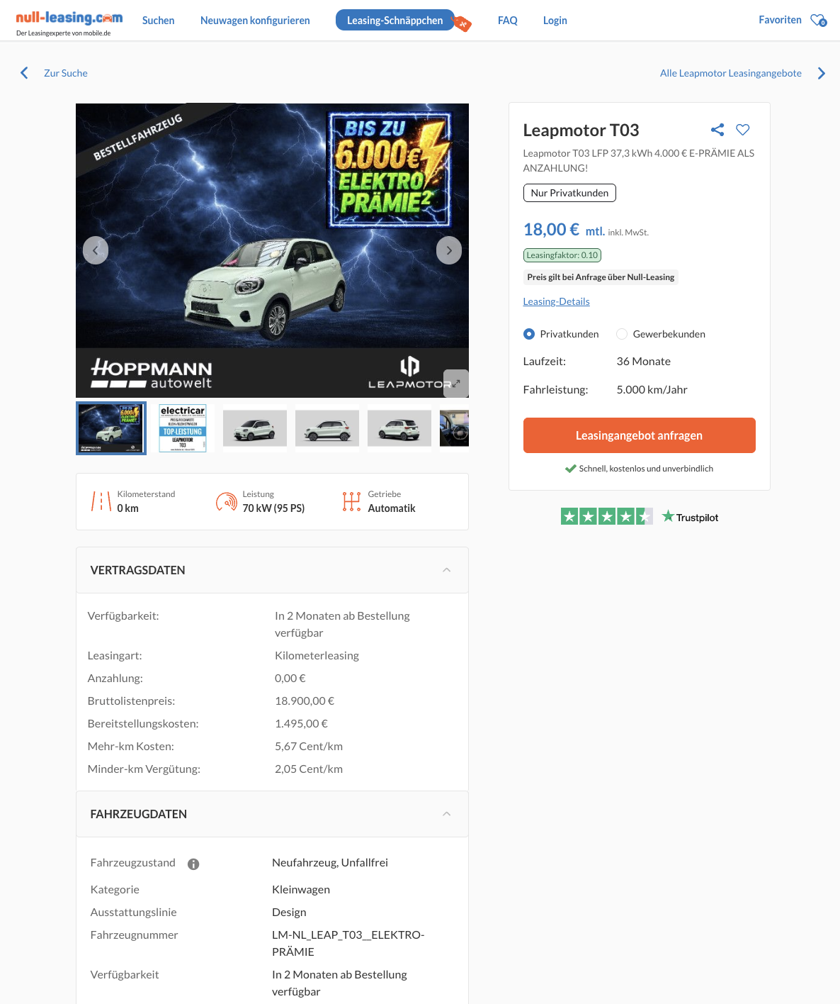 Das Angebot ist auf 36 Monate Laufzeit und 5.000 Kilometer pro Jahr ausgelegt. Damit richtet es sich klar an alle, die überwiegend kurze Strecken fahren oder ein günstiges Fahrzeug für tägliche Wege suchen. Sollte mehr Fahrleistung nötig sein, lässt sich die Laufleistung in der Regel anpassen. Zusätzlich spannend ist, dass Leapmotor beim Platzhirsch nicht gelistet ist, dadurch wirkt das Angebot wie ein echter Geheimtipp für alle, die nicht immer nur die üblichen Marken fahren wollen, sondern ein neues E Auto Konzept ausprobieren möchten.