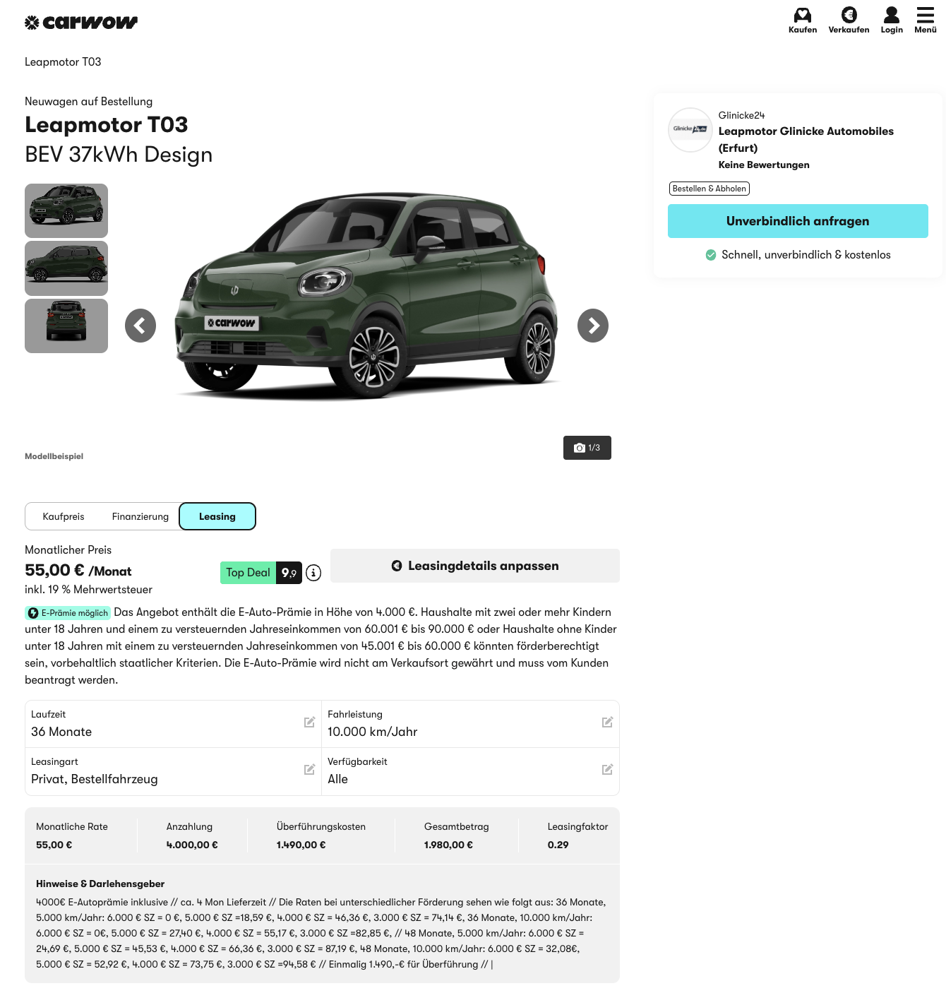 Der Leapmotor T03 ist ein kleines Elektroauto, das vor allem auf günstige Mobilität im Alltag zielt. Leapmotor T03 BEV 37,3 kWh Design bei carwow für 55 Euro brutto im Monat fällt im aktuellen Leasingmarkt deutlich auf, die Rate entsteht allerdings durch eine eingerechnete Sonderzahlung von 4.000 Euro brutto, die über die Umweltprämie angesetzt wurde. Angeboten wird ein bereits bestelltes Fahrzeug, die Lieferzeit liegt bei rund drei Monaten.