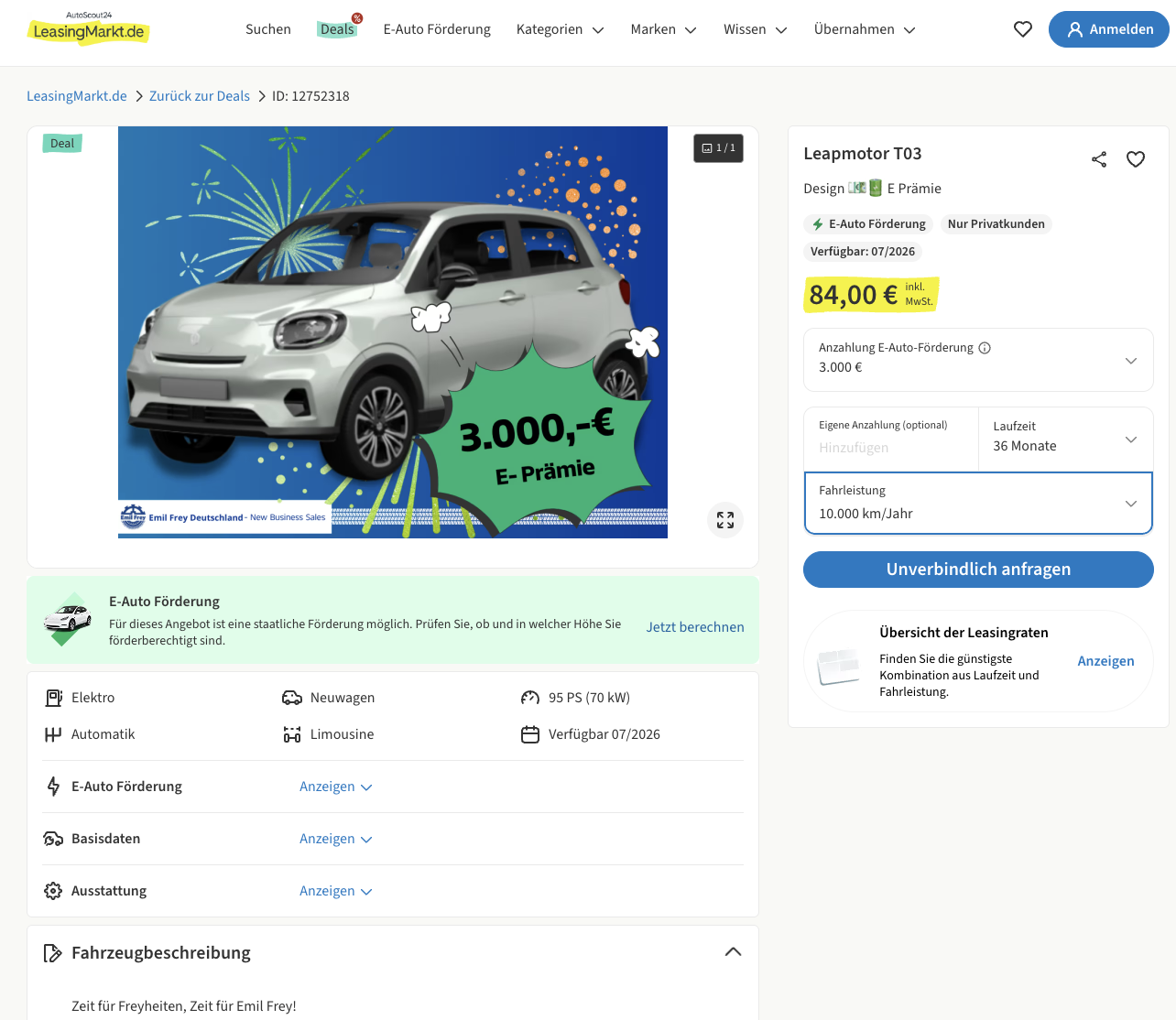 Mit dem Leapmotor T03 ist der Einstieg in die Elektromobilität so günstig, wie noch nie. Leapmotor T03 BEV 37,3 kWh Design bei LeasingMarkt für 84 Euro brutto im Monat richtet sich an alle, die ein kompaktes E-Auto für Stadt und Alltag suchen. Möglich wird die niedrige Rate durch eine Sonderzahlung von 3.000 Euro, die als Umweltprämie angesetzt ist und laut Angaben vollständig erstattet wird. Rechnet man diesen Betrag auf die Laufzeit um, ergibt sich eine realistische Monatsrate von 167 Euro brutto. Die Auslieferung ist für Juli 2026 geplant.