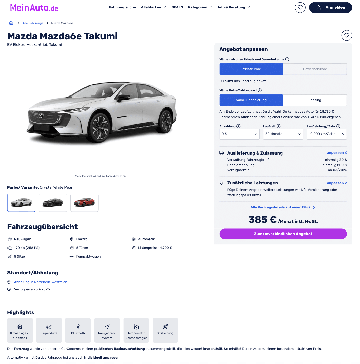 Bei MeinAuto steht die Mazda6e Elektro Limousine Heckantrieb Takumi als Vario-Leasing für 385 Euro brutto im Monat bereit. Ein frei konfigurierbares Bestellfahrzeug, das ihr nach euren Wünschen zusammenstellen könnt. Am Ende der Laufzeit habt ihr die Wahl, Übernahme für 28.736 Euro oder Rückgabe nach Zahlung der Schlussrate von 1.347 Euro, transparent, planbar, genau so soll Leasing heute funktionieren.
